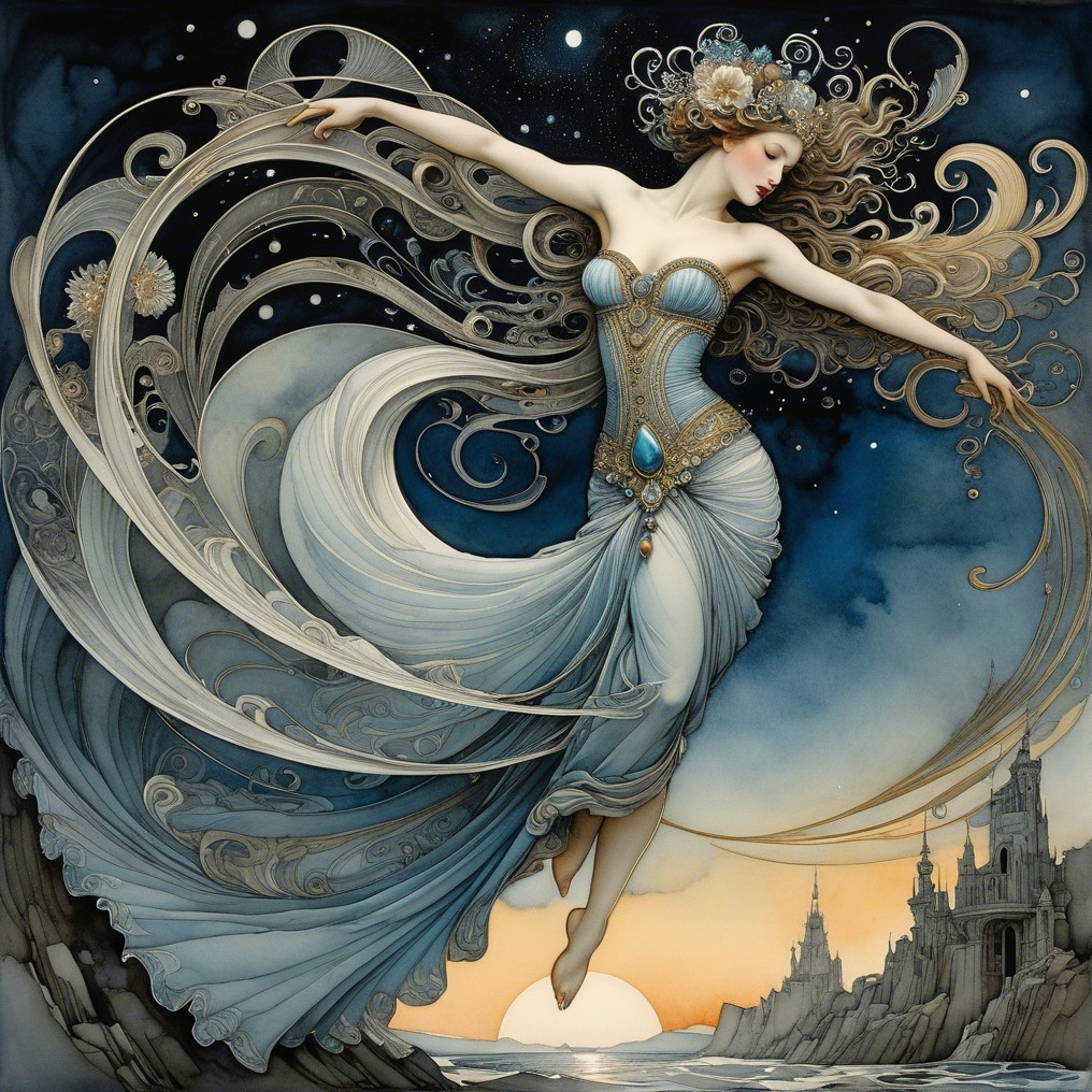 A graceful woman with flowing, curly hair dances against a cosmic backdrop. She's adorned in a blue gown, blending elegance with mystical elements, surrounded by swirling moon and stars.