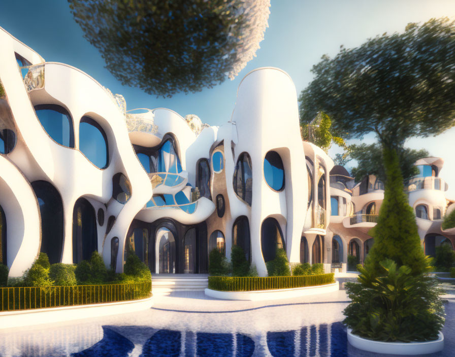 Organic white buildings with round windows, surrounded by trees and reflective pool