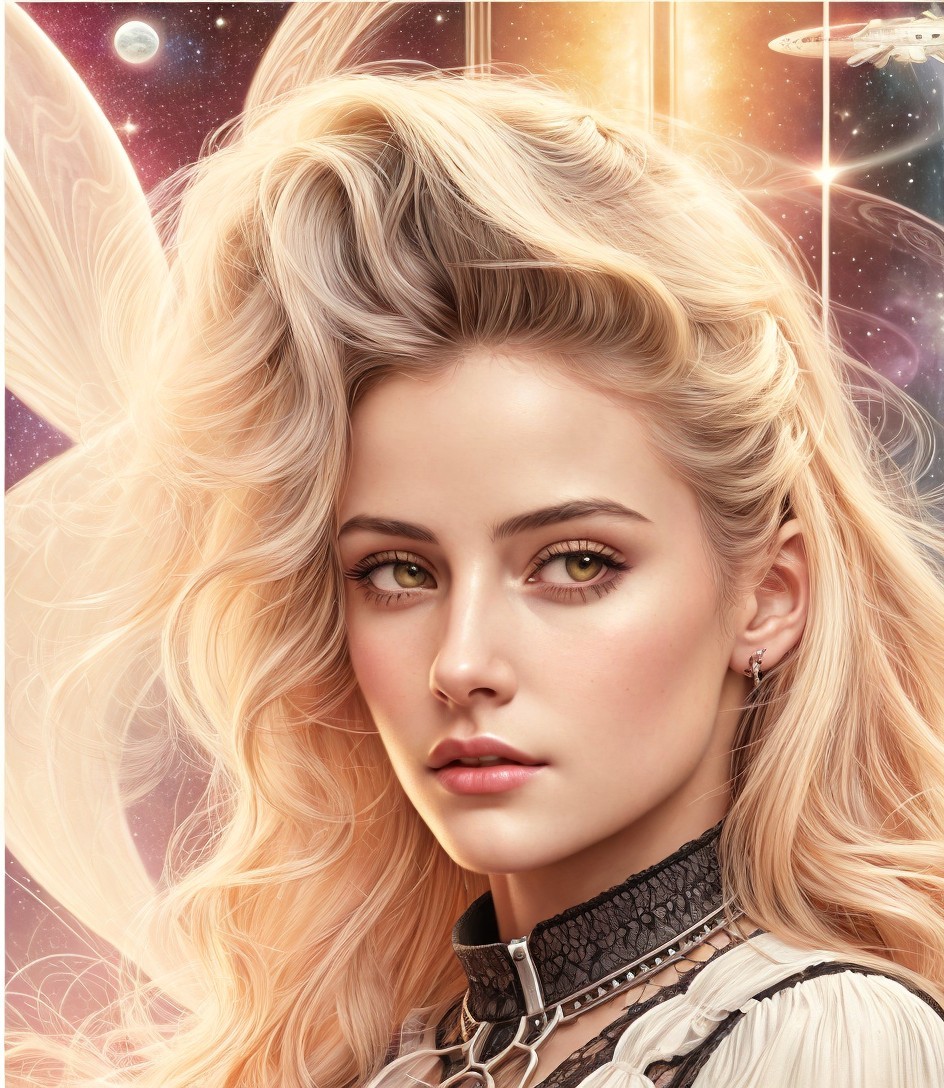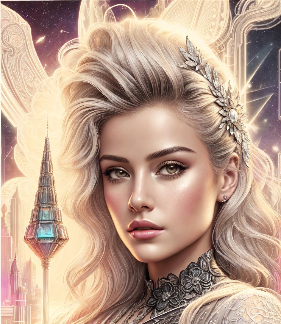 + Prompt:Book cover arr, line-art, science fiction illustration merged with pulp art, Style of lou feck and Rafael gallur, Pencil and charcoal drawing with intricate crackles, serene portrait of beautiful teenage heroine, glamorous, lavish, plasticity 1.3, auracore, anglo gothic 1.7, octane render illustration, luminosity 1.9, concept art, mystery essence, muted tones of purple and beige, hues, dyed, crystalline details, traumacore 1.2 squiggly lines in background, space age style collage, american gothic 1.3, overall composition by Overton Loyd and Brad Kunkle and Stan lee and Steve hanks, stylized illustration 1.5,