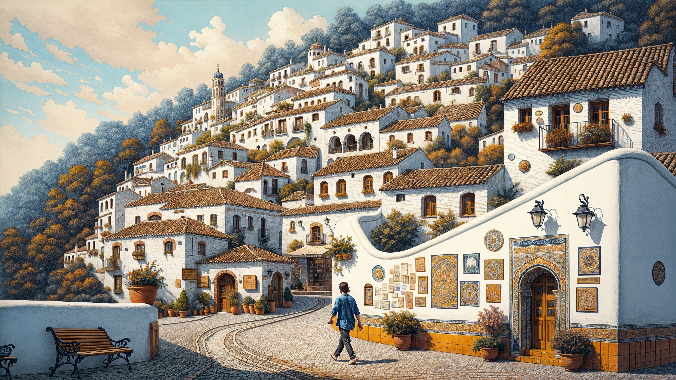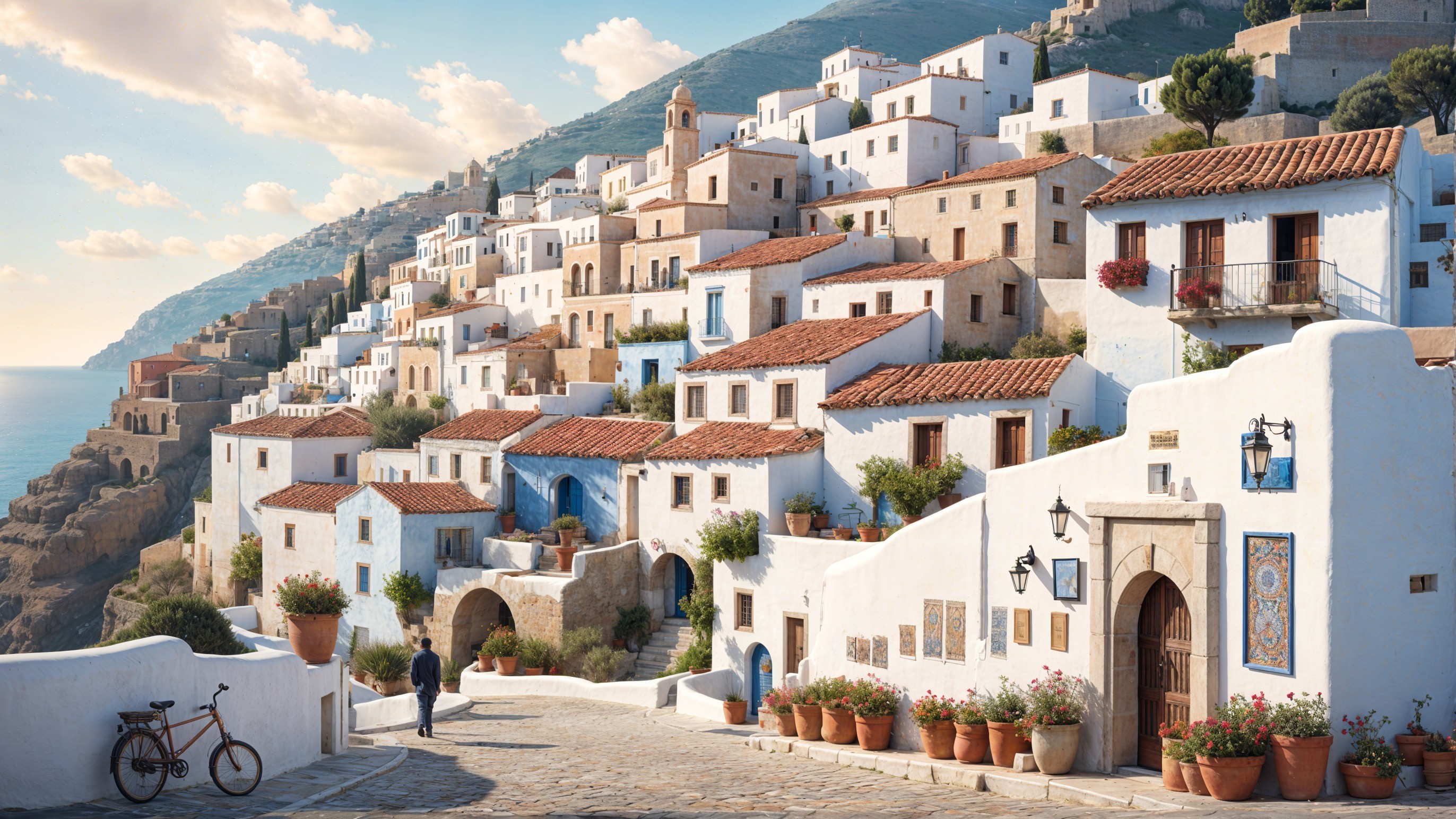 The image depicts a charming hillside village with whitewashed buildings, terracotta roofs, and vibrant flower pots lining the streets, set against a backdrop of lush greenery and a clear sky. The white villages of Spain, known as Pueblos Blancos, are a collection of picturesque whitewashed towns and villages primarily located in the Andalusia region, especially in the provinces of Cádiz and Málaga. Based on a photography of white village - Mijas, Spain. 09.2025.