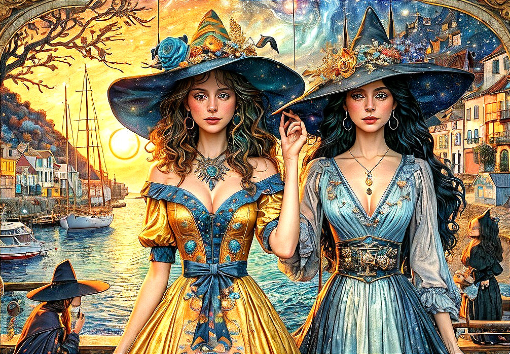 Two witches in elaborate dresses and hats with a cosmic design stand before a twilight harbor scene, exuding a mystical aura.