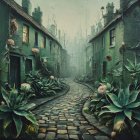 A pictural surrealist scene of an old curved cobblestone street lined with green brick houses, each with crooked doors and small windows glowing faintly. Enormous blooming succulents spill over the edges of the street, their thick leaves and strange flowers casting eerie, distorted shadows across the walls. The air feels heavy and silent, with no people — only surreal, dreamlike light filtering through mist. Painted in a rich, textural style reminiscent of René Magritte or Giorgio de Chirico, with expressive brushstrokes and mysterious depth.