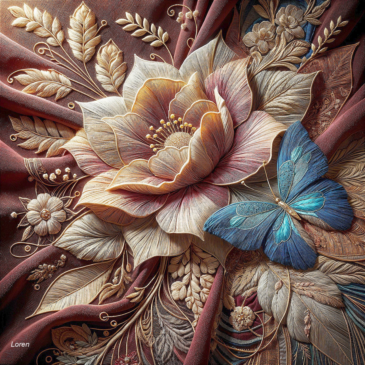 A stunning floral arrangement features a large, intricately detailed flower in warm tones, accompanied by a vibrant blue butterfly, all set against a rich, textured backdrop of leaves and petals.