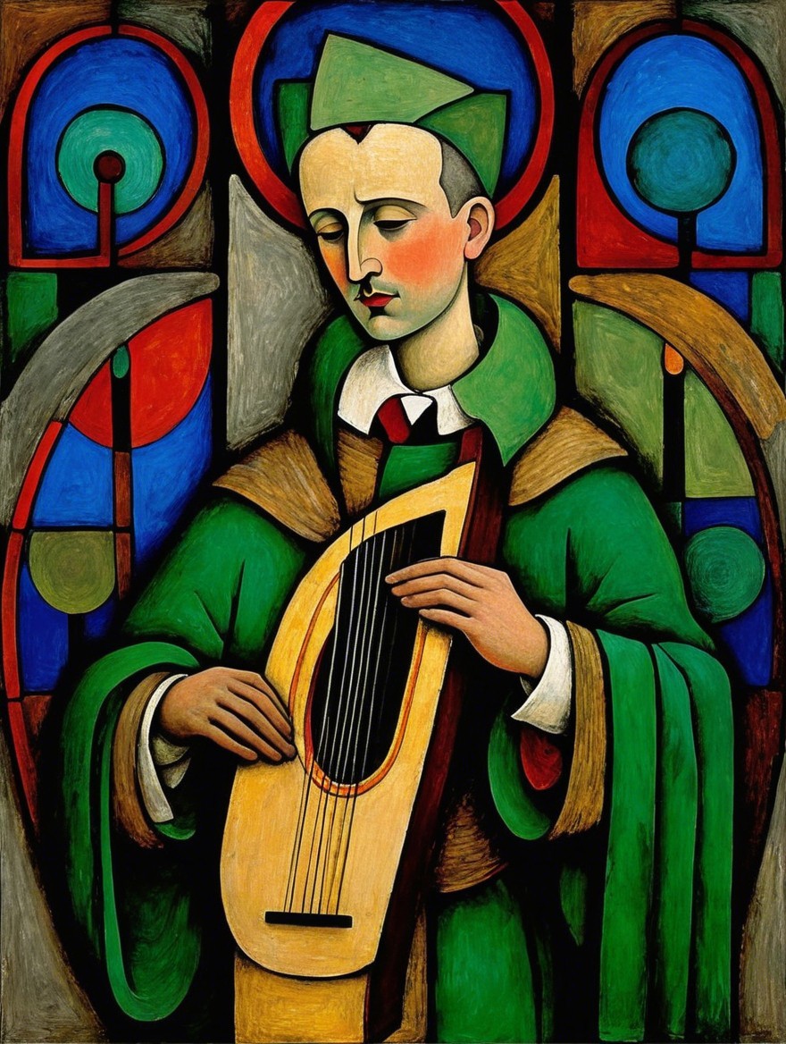 A Celtic harpist, stylized male, holding an Irish or Scottish Harp, surrounded by geometric shapes and bold colours.