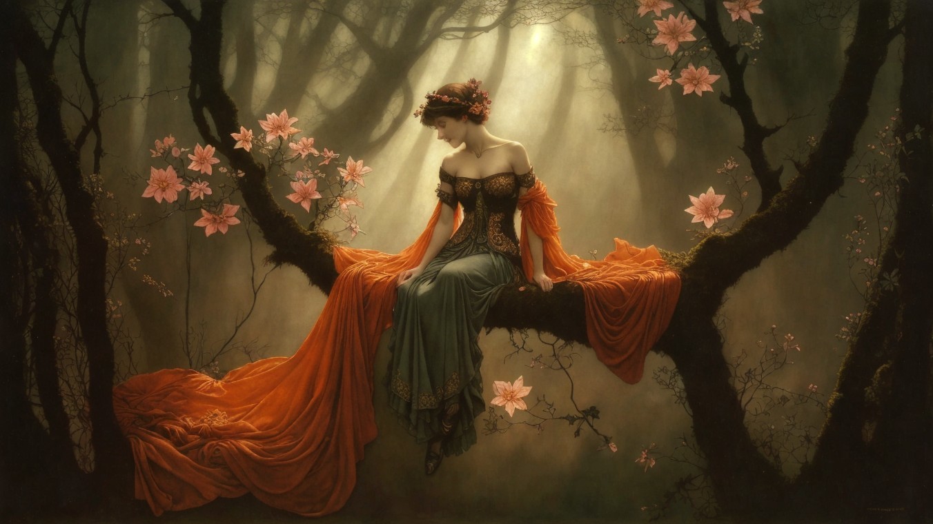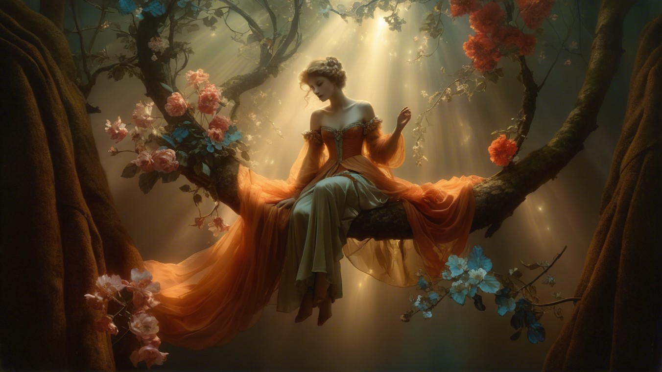 A serene woman sits gracefully on a tree branch, surrounded by blooming flowers. Ethereal moons glow in the background, creating a mystical atmosphere with rich colors and soft light.