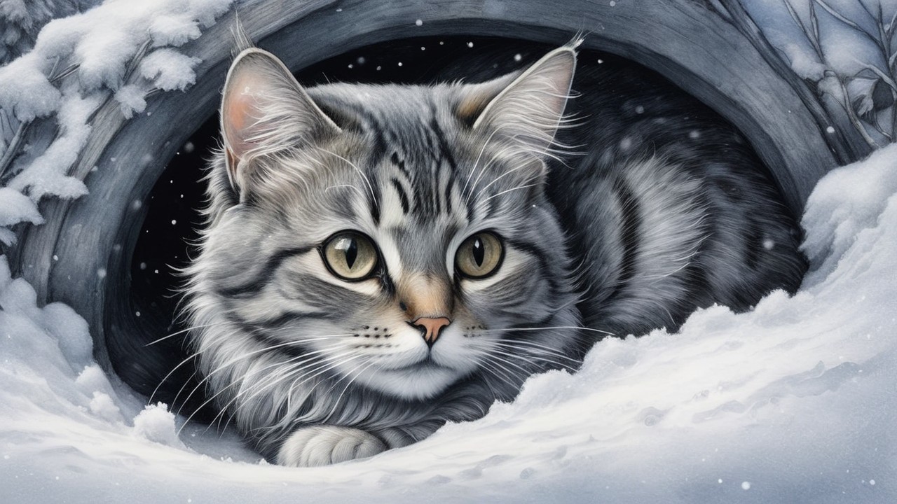 A fluffy gray tabby cat with large, expressive eyes rests in a snowy hollow. Soft snowflakes fall around, creating a serene winter scene. The cat looks curious and cozy amidst the winter setting.