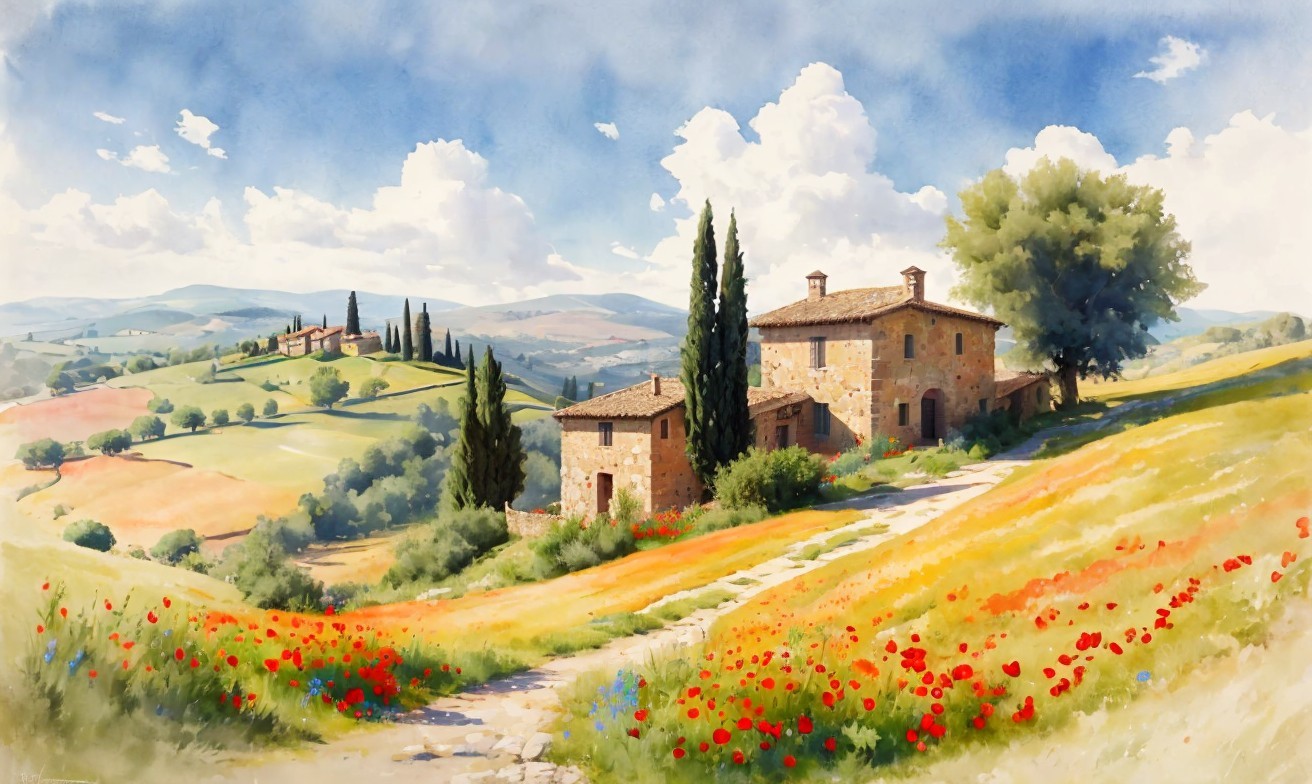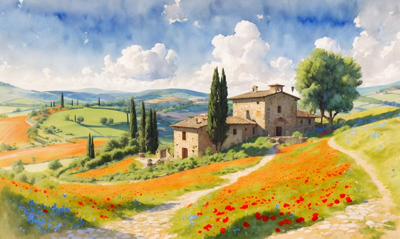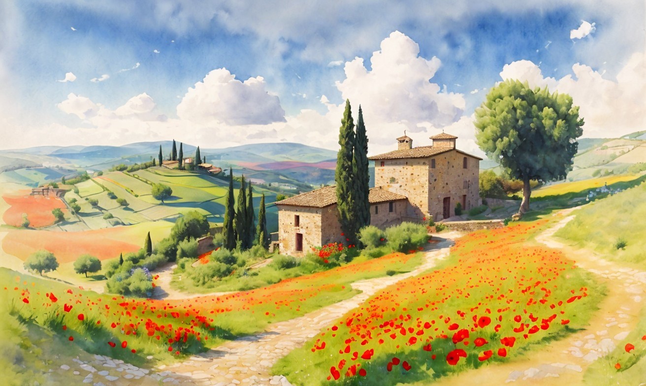 + Prompt:Panoramic landscape with an old stone cottage on a hill in Tuscany, summer, blue sky, cobblestone path, red poppies, green cypresses, low angle view, high resolution, watercolor painting, smooth edges, colorful, clear, high detail, imperial colors, very attractive, razor-sharp poster, by Thomas Wells Schaller