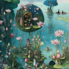 A fantastical underwater scene featuring elegantly adorned figures surrounded by swirling patterns, vibrant flowers, and ornate designs, creating a dreamy, ethereal atmosphere.