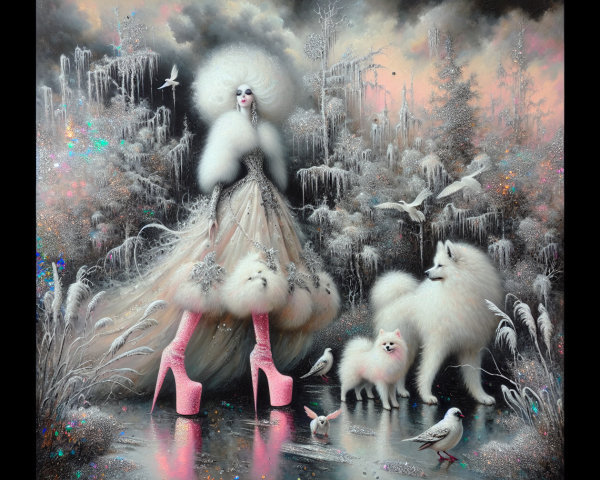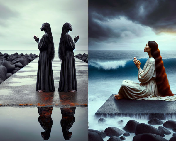 A woman with exotic makeup and traditional jewelry is shrouded in shadow, her gaze intense and mysterious.