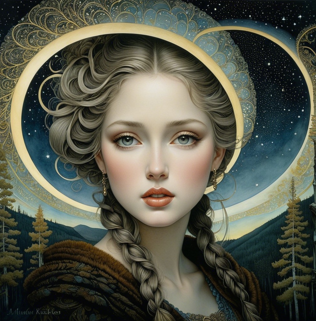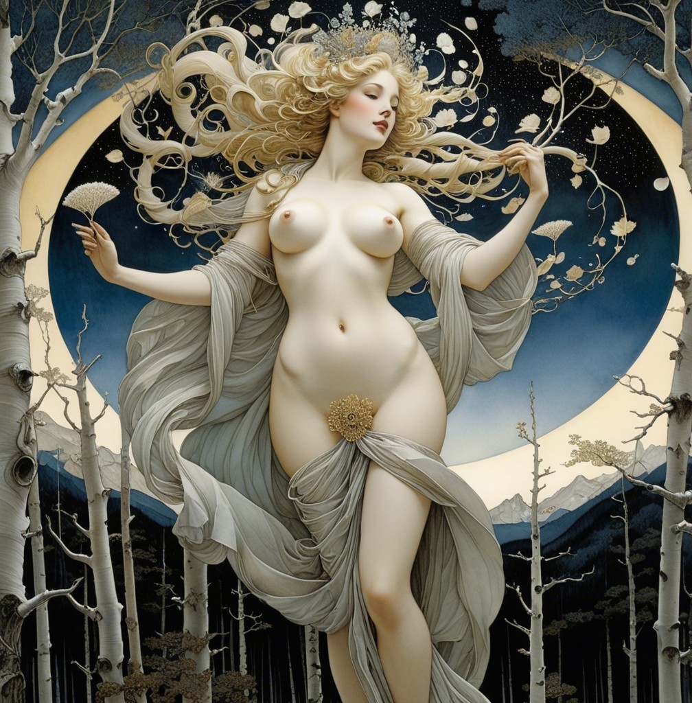 A captivating figure of a ethereal woman draped in flowing white fabric, adorned with intricate details. Surrounded by pale birch trees, she exudes a mystical, enchanting aura.