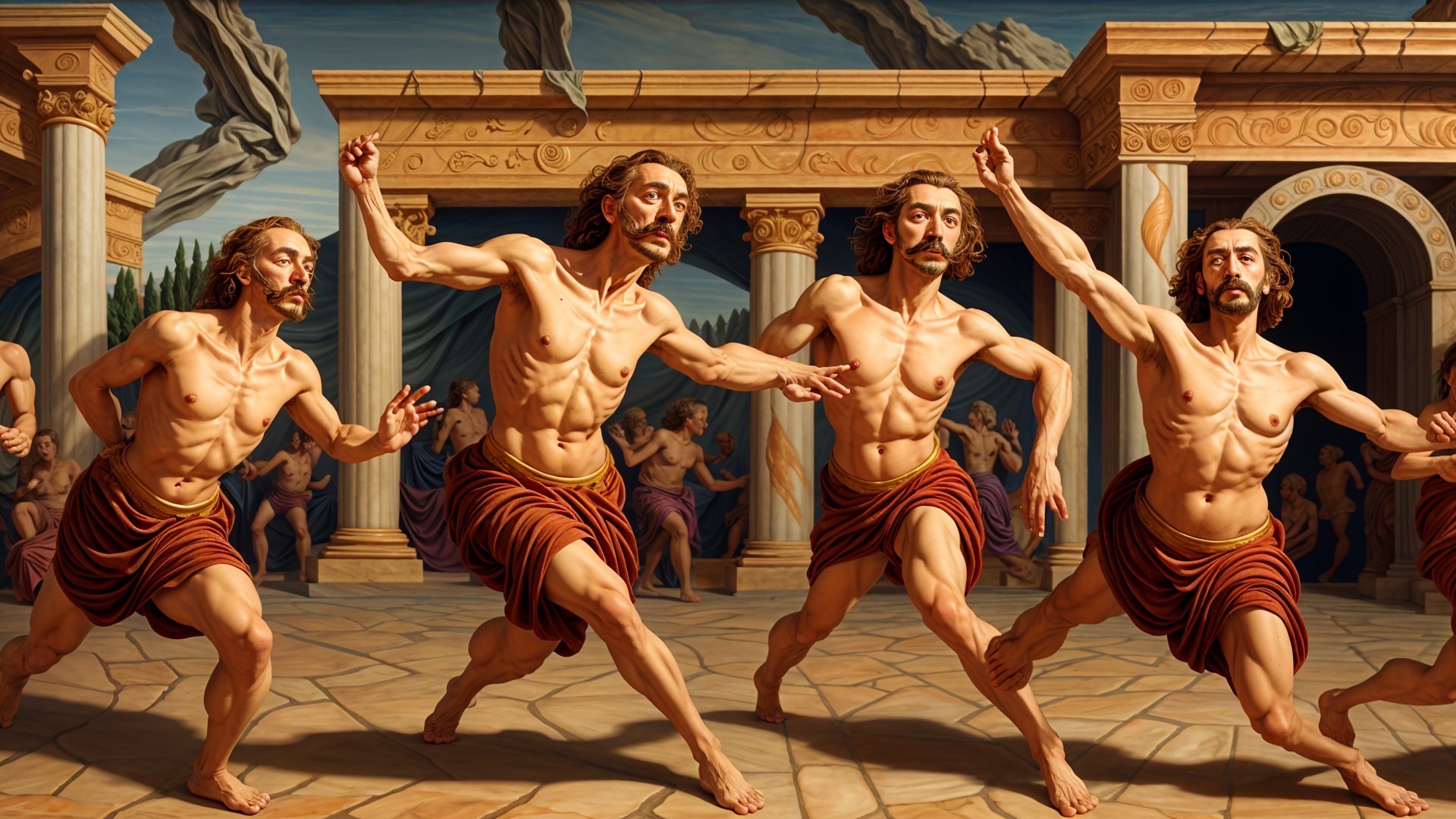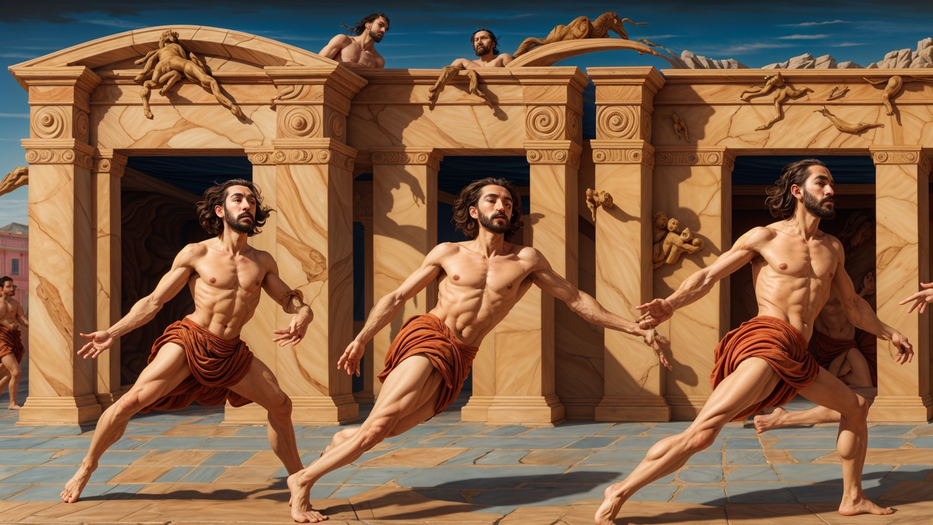 The image depicts four athletic figures running in a classical architectural setting, surrounded by sculptures and a serene pool under a dramatic sky, embodying both movement and ancient artistry.
