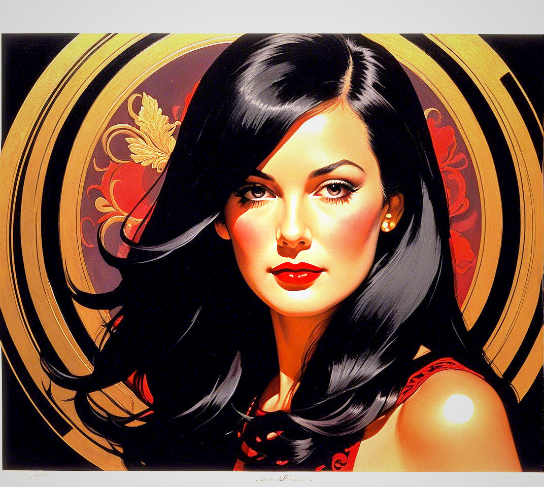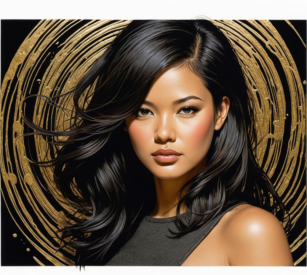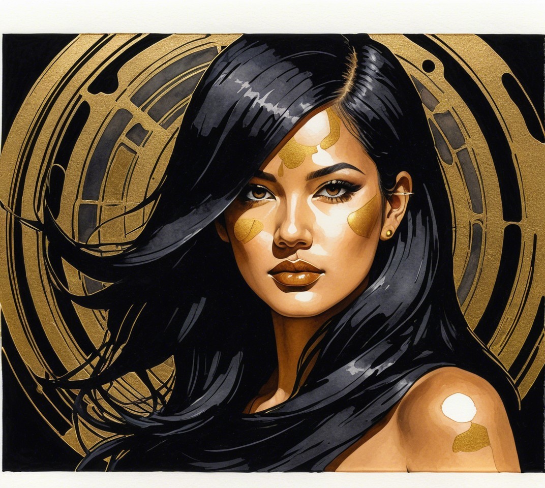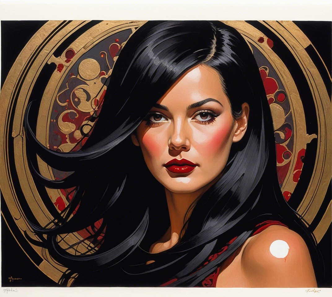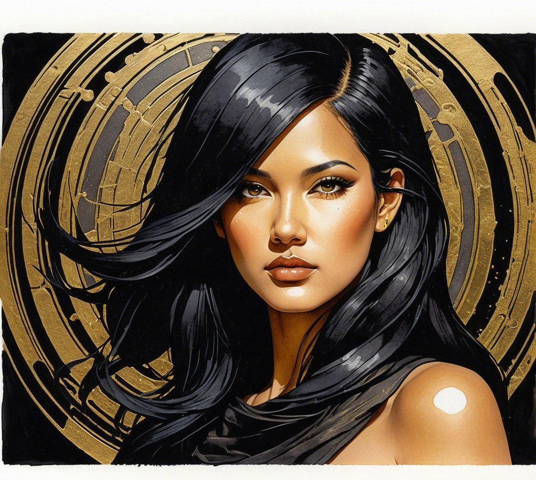 Prompt: Abstract lineage illustration by Larry niven. Headshot in Rich blacks, burgundy's and blood-red hues meld with the gothical ornate details of stan lee and frank Fazetta, tiny brushstrokes of gil bruvel and Leonora Carrington, expired film, 1970s advertising art, soft dappled lighting, renaissance painting, gouache, misty background, raytraced shadows, dark, 135 mm photography, ominous atmosphere, reminiscent of Overton Loyd, unique aesthetic, otherworldly, high detail, brushed textures, simplistic style, mysterious storybook illustration art by John buscema, tints of freda people and Susan Seddon Boulet, 1970s advertising art merged with Renaissance portrait, dyed,surreal, cosy face expression, dripping details, orbs, blobs, stone wall textures, otherworldly, overspray of paint, Bloom-Effect, plasticity 1.3, anthotype, anatomically correct features, precise Gelsculpt 64K, parallax occlusion 1.2, raytraced shadows 1.8, divisionism, rule of thirds, line-art patchwork 1.8, volumetric lighting. Airbrush art. 3D Art . It should also include elements from fashion illustration and art deco design. An elegant and sophisticated painting reminiscent of Enoch Bolles, watercolor extrusio, refined Colors: Dark, elegant tones such as brown, gold, dark red or deep beige. HD , intricate precise Gelsculpt 64K uhd, vfx,uhd, Octane render illustration,