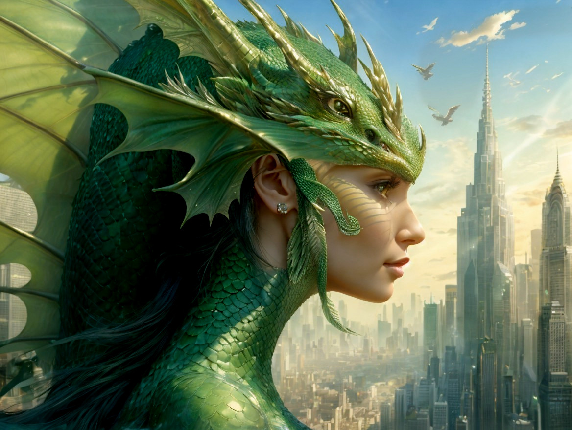 + Prompt:A beautiful amazing middle-aged woman with a beautiful green dragon, in the sunlight over a modern metropolis, clearly worked out details, high resolution, gentle radiance, high definition, high detail elaboration, high resolution, Hyper detailed ingenious, light reflections, refined, Sunshine rays, ultra-clear image, ultra-confusing