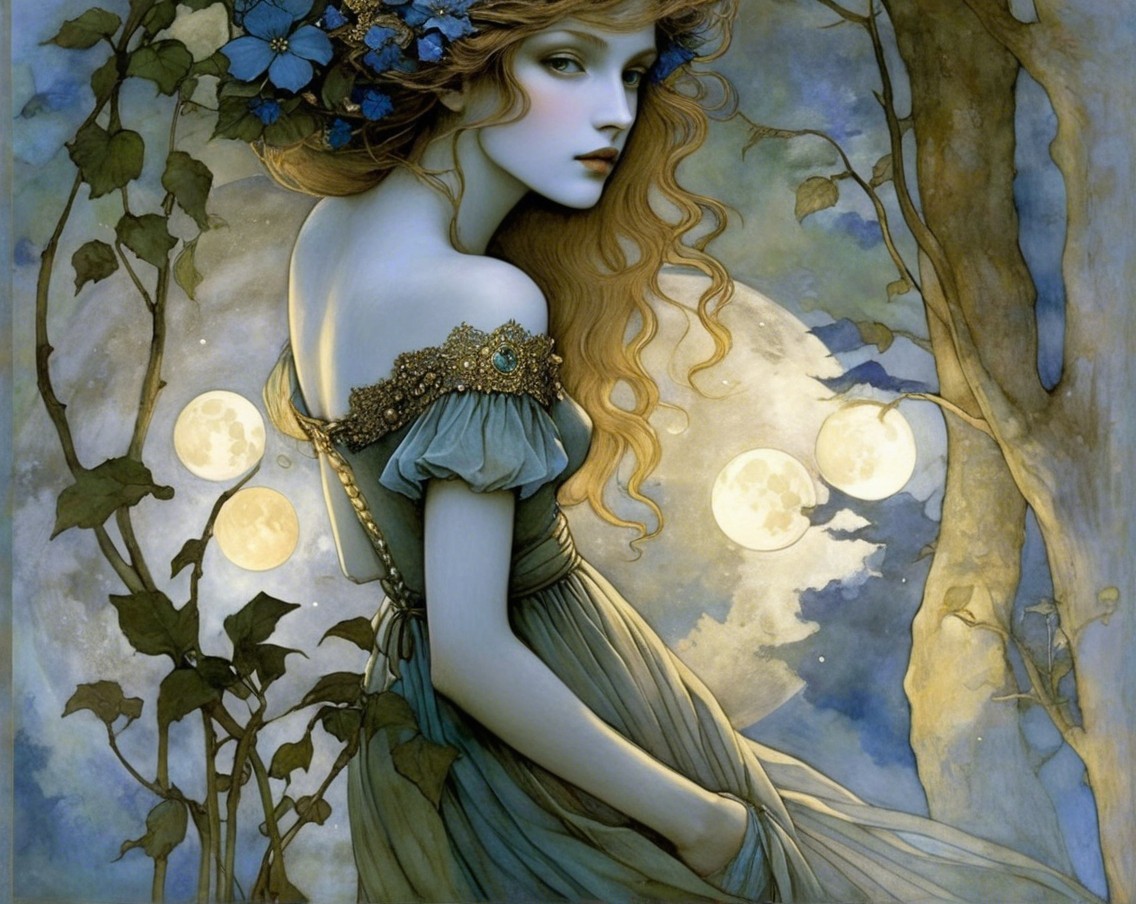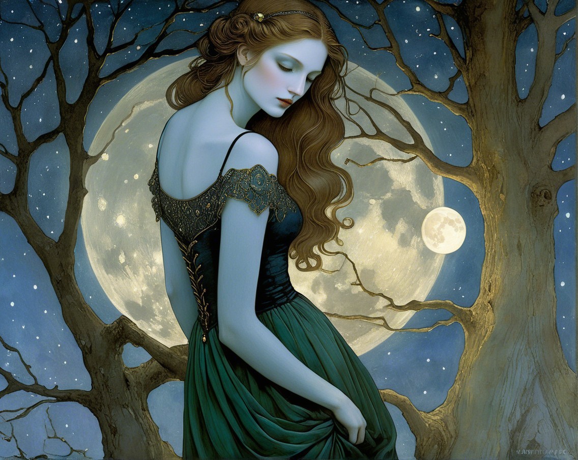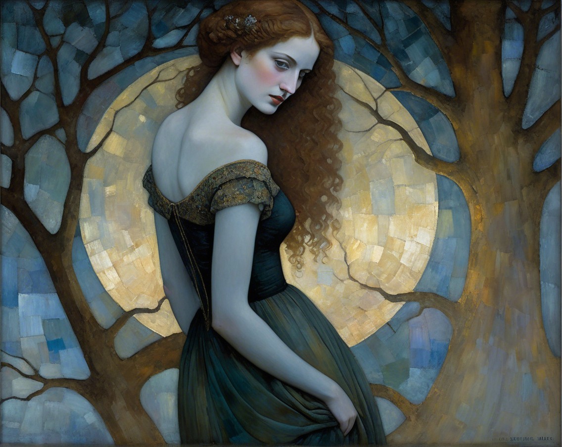 The artwork features a woman with flowing hair, dressed in a dark gown, set against a backdrop of circular patterns and bare trees, evoking a sense of mystery and elegance.