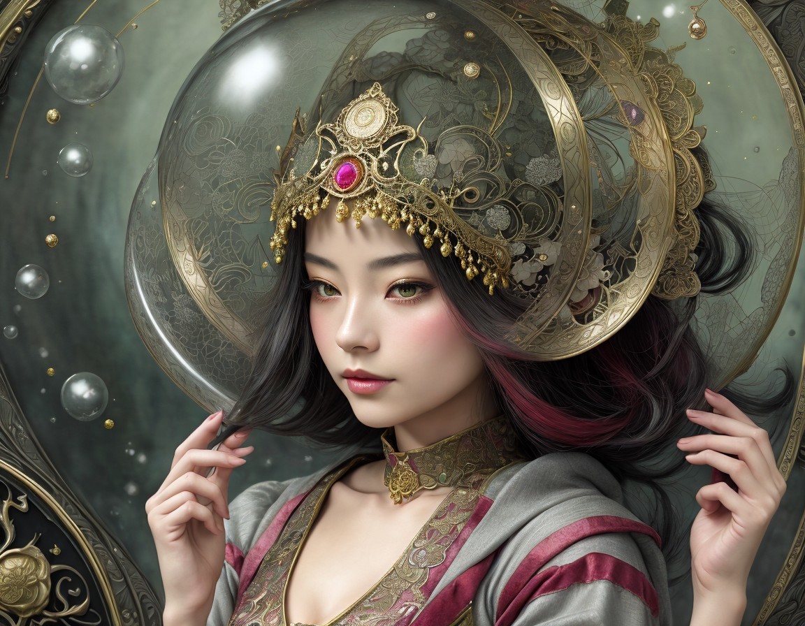Beauty girl in a bubble,, Medieval Japanese Artists Sumi-e Style, grayish green, Ruby red, Velvet Black, Shabby, Dull Gold, Amber Gray, Golden Ratio, Surreal Fantasy, Elegant, High Definition Ultra Fine 3D Line, Zenangle Style, Watercolor Patchwork , Arthur Rackham Style, Paul Kidby, , Jacek yerka, Extremely Detailed, Intricate, Thoughtful, HDR, Fractal, Beautiful, Award Winning, Fantasy Look, Fantasy, Crisp Quality