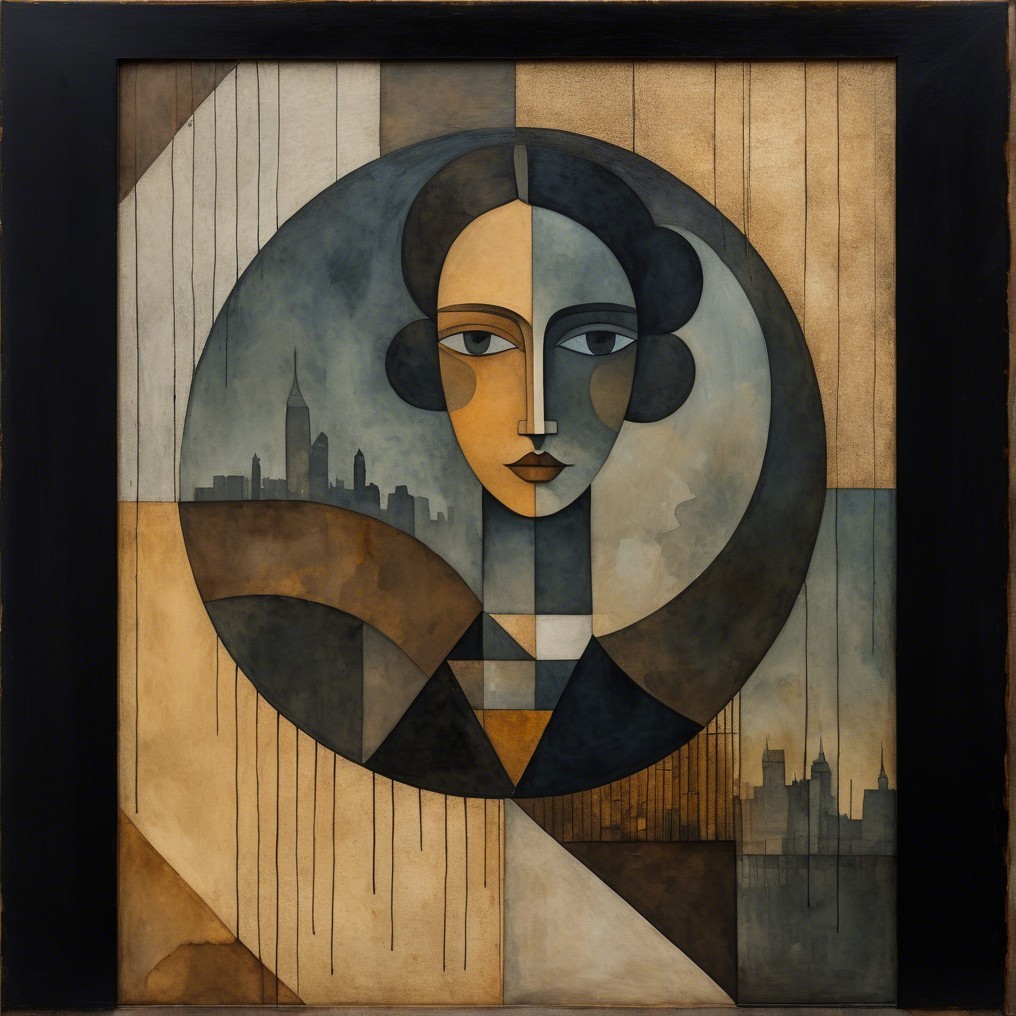 A striking portrait of a woman with a divided face, featuring warm earth tones and abstract patterns. Delicate flowers accentuate her hair, enhancing the artwork's unique style.