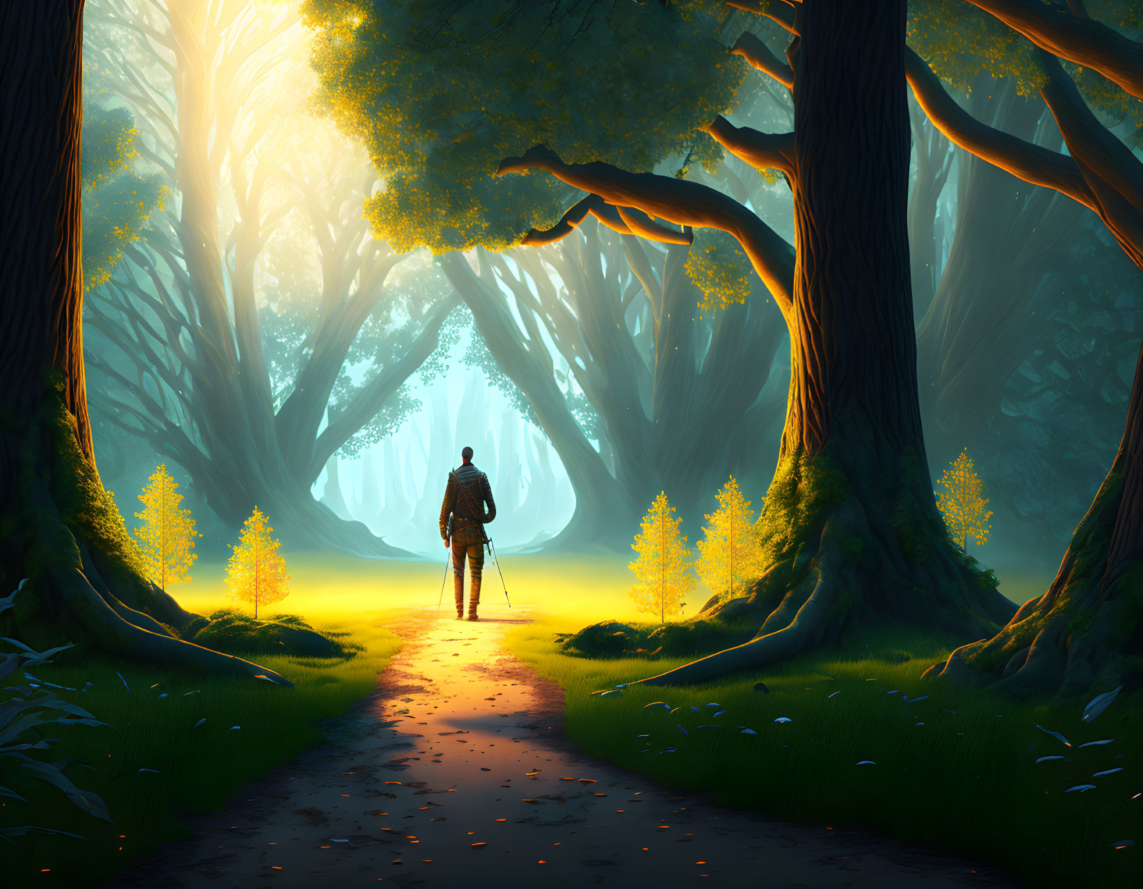 Prompt: Two characters in one frame, One is archer taking aim, one is writer writing a book | day and night, warm and cool contrast, opposition, psychological horror, insanity, illuminated path leading to an opening in a divided tree, gateway to another reality.