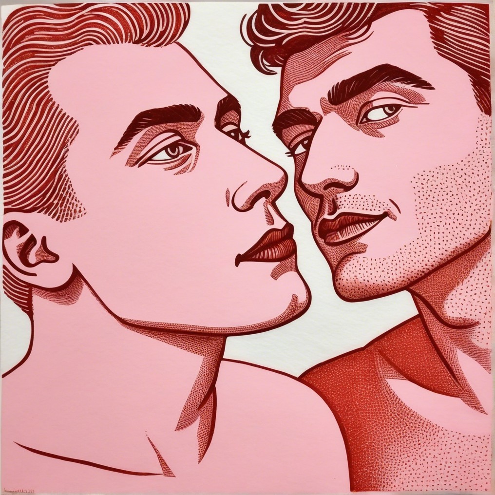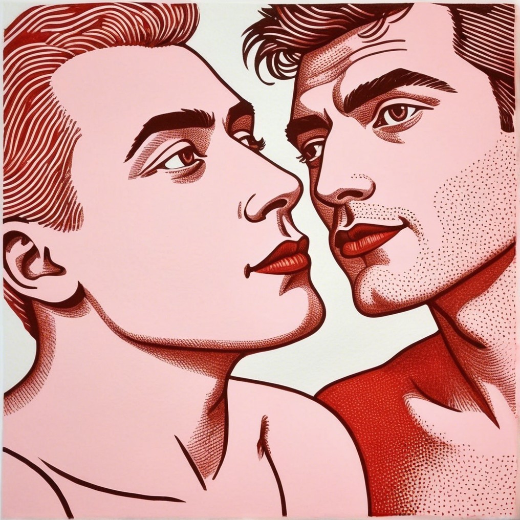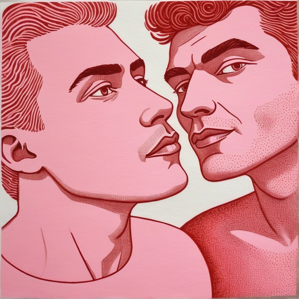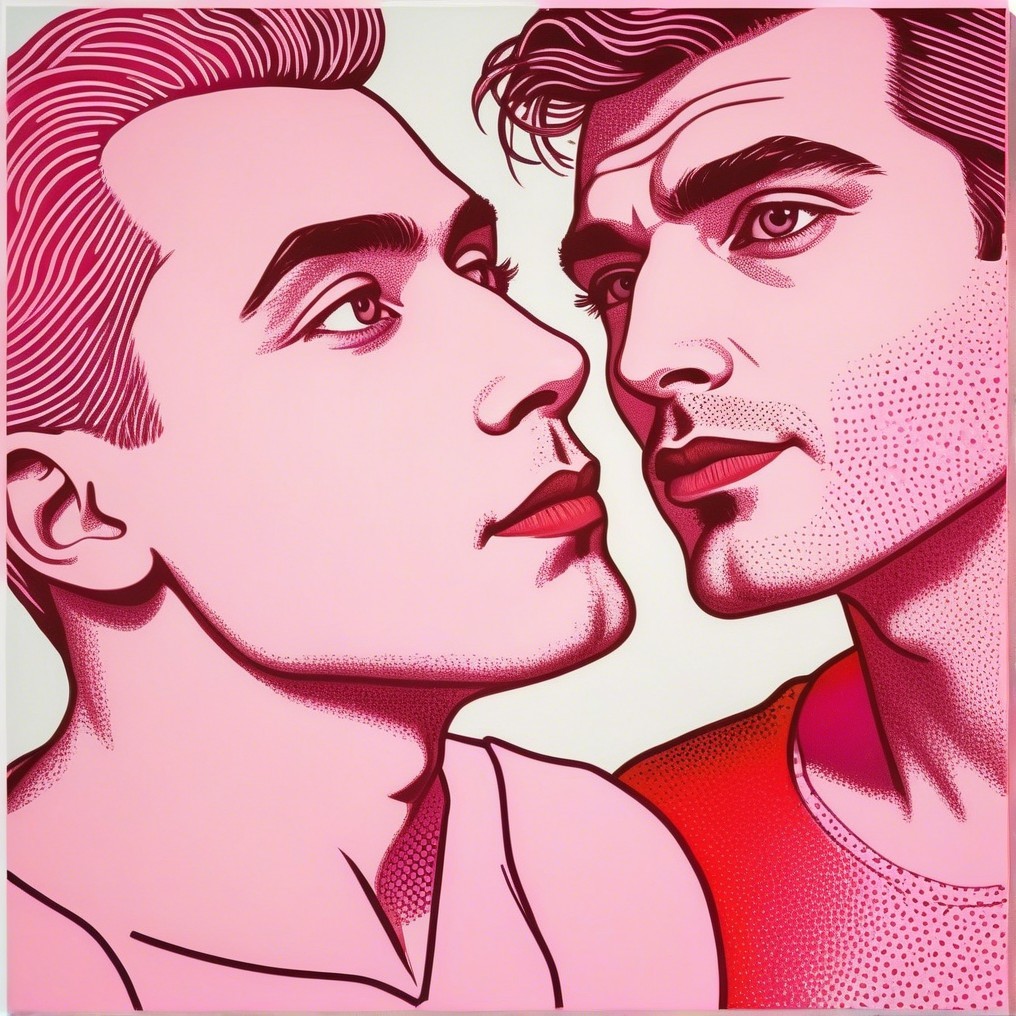 A powerful pop-art portrayal of two men in intimate gaze, executed in electric pinks and reds. Polished linework, radiant gradients, and small symbolic elements like a heart earring create a deeply tender and iconic moment of queer love.