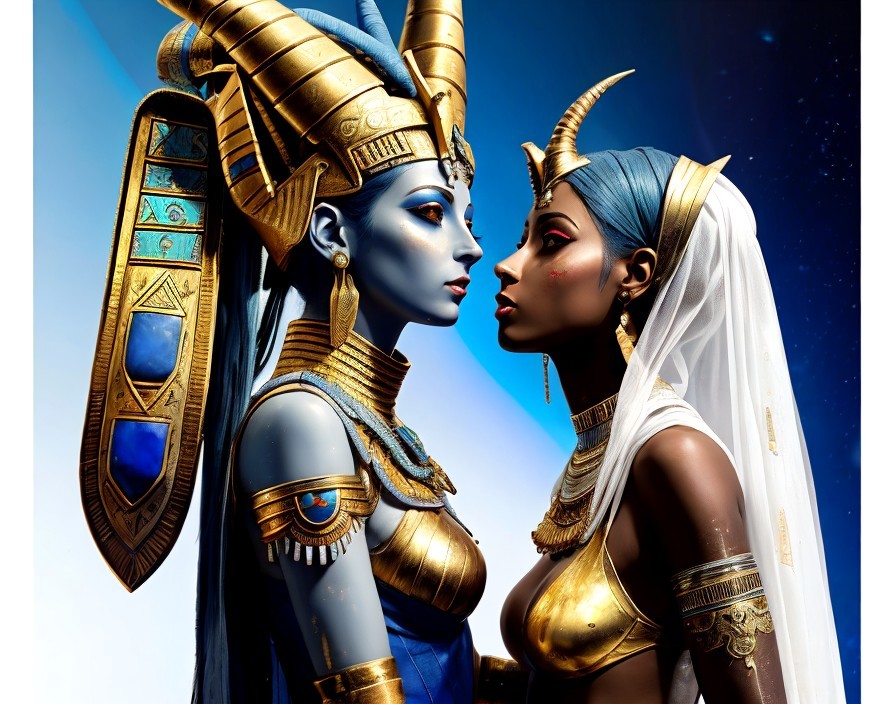 Prompt: "Amenhotep, ancient pharaoh is kissing Nefertiti, full body, Pale Blue and Silver and Gold and Crimson. Rurral art. Graphite, paint and mixed media. symmetrical spectral arafed anime woman with horns and a veil on her head, ash thorp, porcelain pale skin, H.R. Giger's nightmarish splash art, sculpture of satyress, translucent 3d illustration, qifeng lin, james jean aesthetic, ( ( ( horror art ) ) ), satanic, pale pointed ears, human,visible red blood vessels, sorceress, Dee Nickerson and Alberto Seveso by Qian Du, translucent, nephilim, glowing neon vray, elden ring art, elle fanning, tumblr, biblically accurate angels, pale blue skin, love and mercy, satyr, art-gem, early 90s cg, arcana, moonstone, visible azurit blue vessels, she is like Giger's Alien-like Soap bubble-like Alien Eldritch Macabre Species in full translucent mucus, bloody red and honey with azurit blue - A Dystopian Dark Ambient Hyper-detailed hyper-realistic photo-realistic ornate meticulously detailed, muted colors in, meticulous, intricate and highly detailed illustration by jean-baptiste monge, by Justin Ger8ard, by Brian Froud, hyper-realistic, ornate, meticulously detailed, muted colors, muted colors, meticulous, intricate, highly detailed il. Cinematic light. Work of art. Extremely detailed"