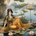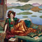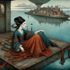 A serene figure in a red dress sits on a winding staircase by water, overlooking a whimsical town with pointed roofs. The atmosphere is dreamy and slightly surreal, evoking mystery and calm.
