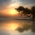 A serene sunrise reflects on a calm lake, where a lone rower gently paddles toward a mist-covered island surrounded by tall trees, creating a peaceful, timeless scene.