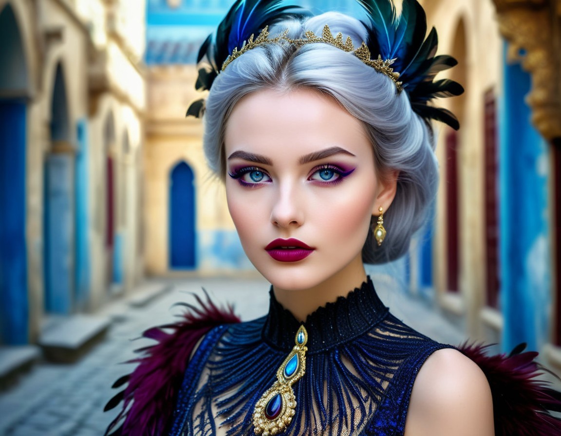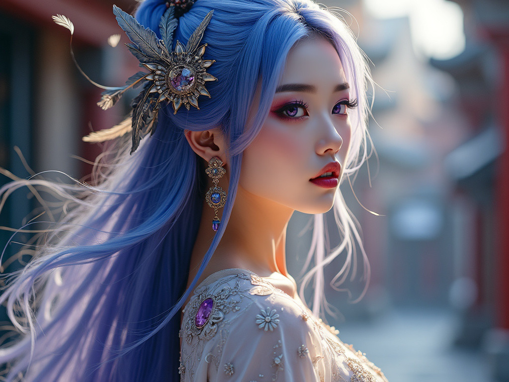 A stunning young woman with long, flowing lavender hair and bold makeup featuring vibrant eyes and deep red lips. She wears intricate jewelry and a beautifully detailed outfit, set in an exotic backdrop.