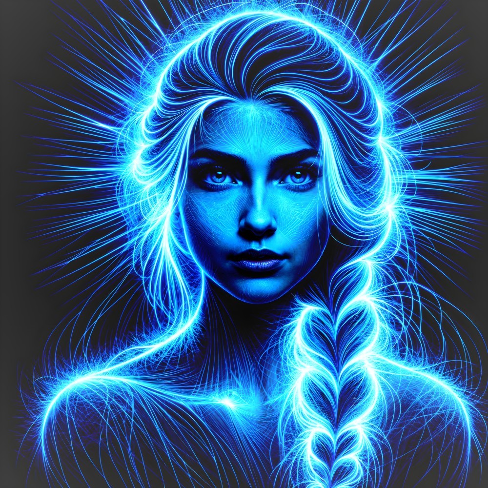 A luminous blue portrait of a woman with flowing hair, intricately designed with glowing lines and radiant rays, creating an ethereal and surreal effect. The background contrasts with her vibrant aura.