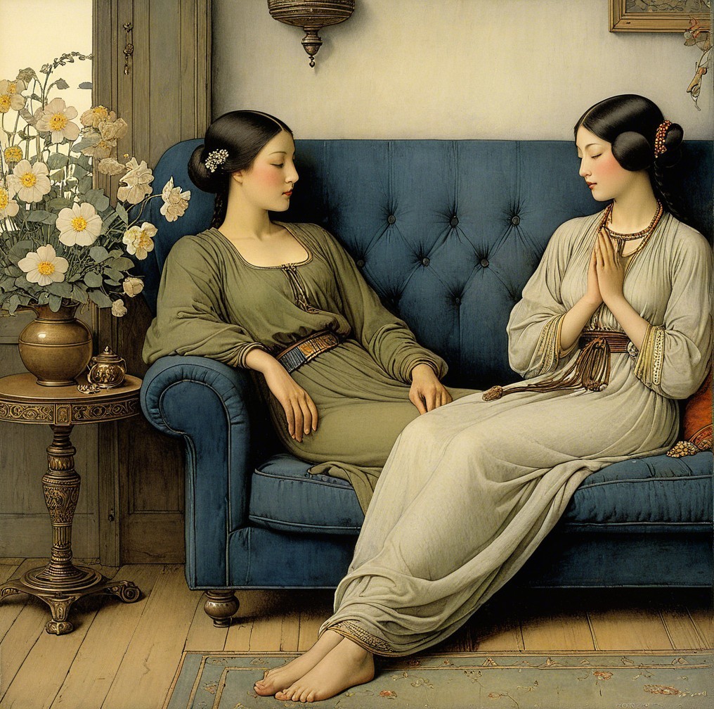Two women sit elegantly on a blue sofa, one holding a flower. They are dressed in flowing gowns with intricate patterns, surrounded by a serene backdrop and a vase of daisies nearby.
