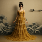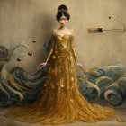 A majestic figure in a flowing golden gown adorned with swirling patterns and ornate details. The backdrop features ethereal shapes and colors, creating a dreamlike atmosphere.