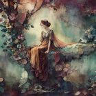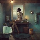 A serene bathroom scene features a woman standing by the mirror, illuminated by soft light. The vintage decor includes a clawfoot tub, a wooden vanity, and elegant wall art, creating a tranquil atmosphere.