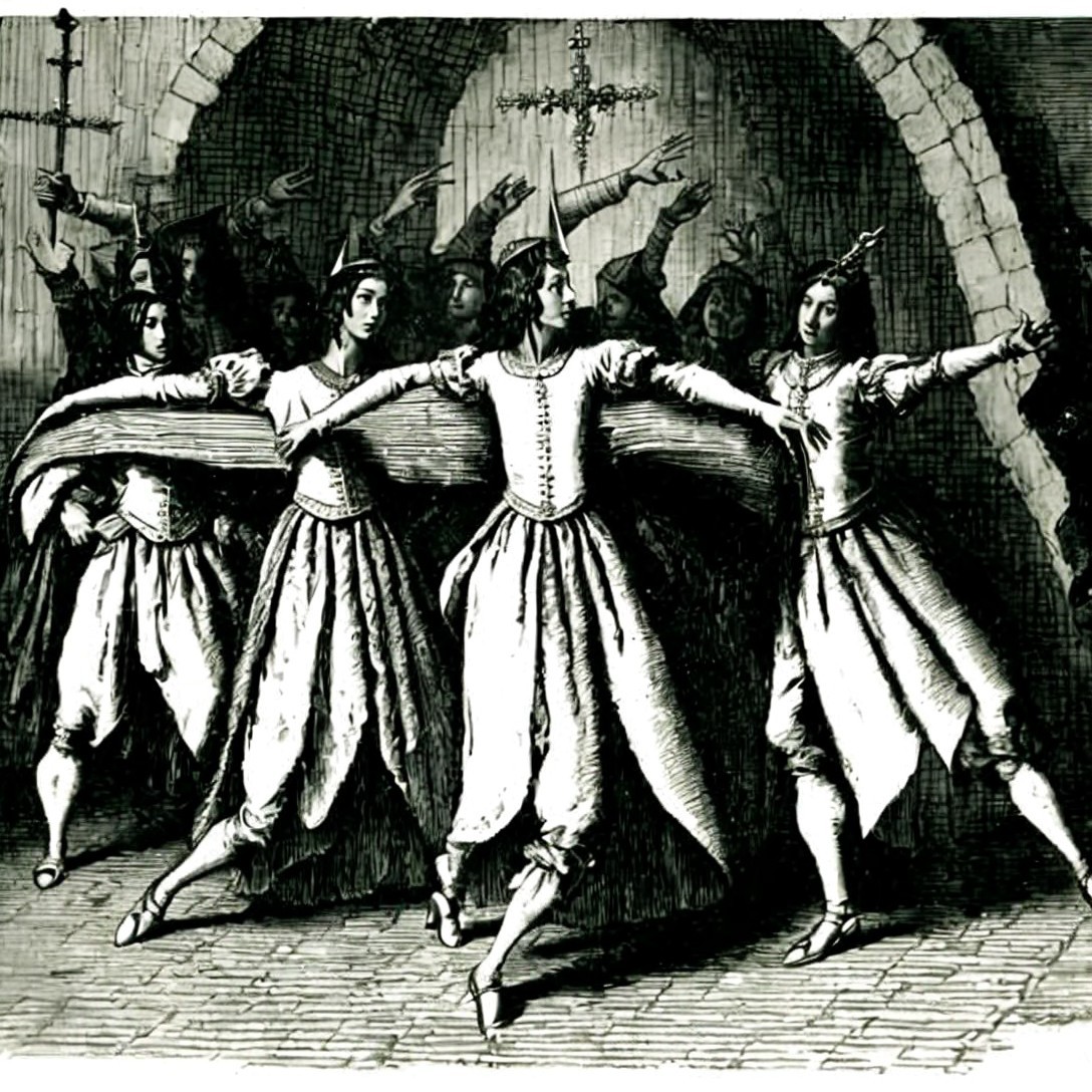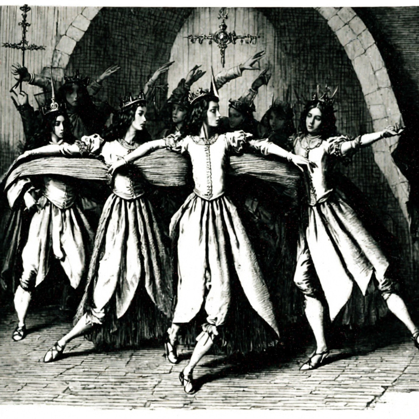 Vintage photo of a group of ballet dancers in costume, performing on stage, with synchronized poses and flowing dresses.
