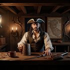 A rugged pirate sits at a wooden bar in a dimly lit tavern, holding a tankard. The shelves are lined with bottles, and maps adorn the walls, creating a adventurous maritime atmosphere.
