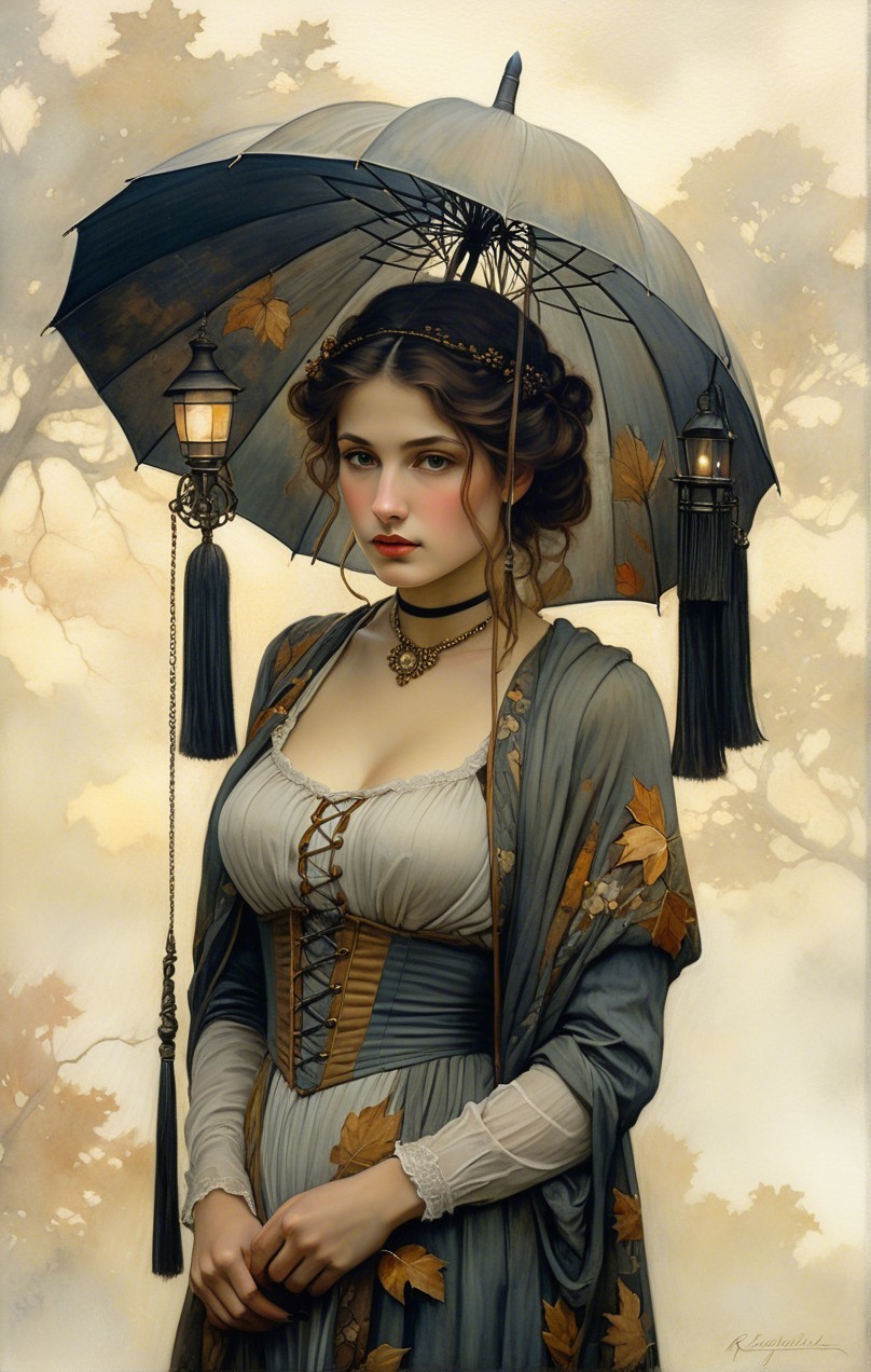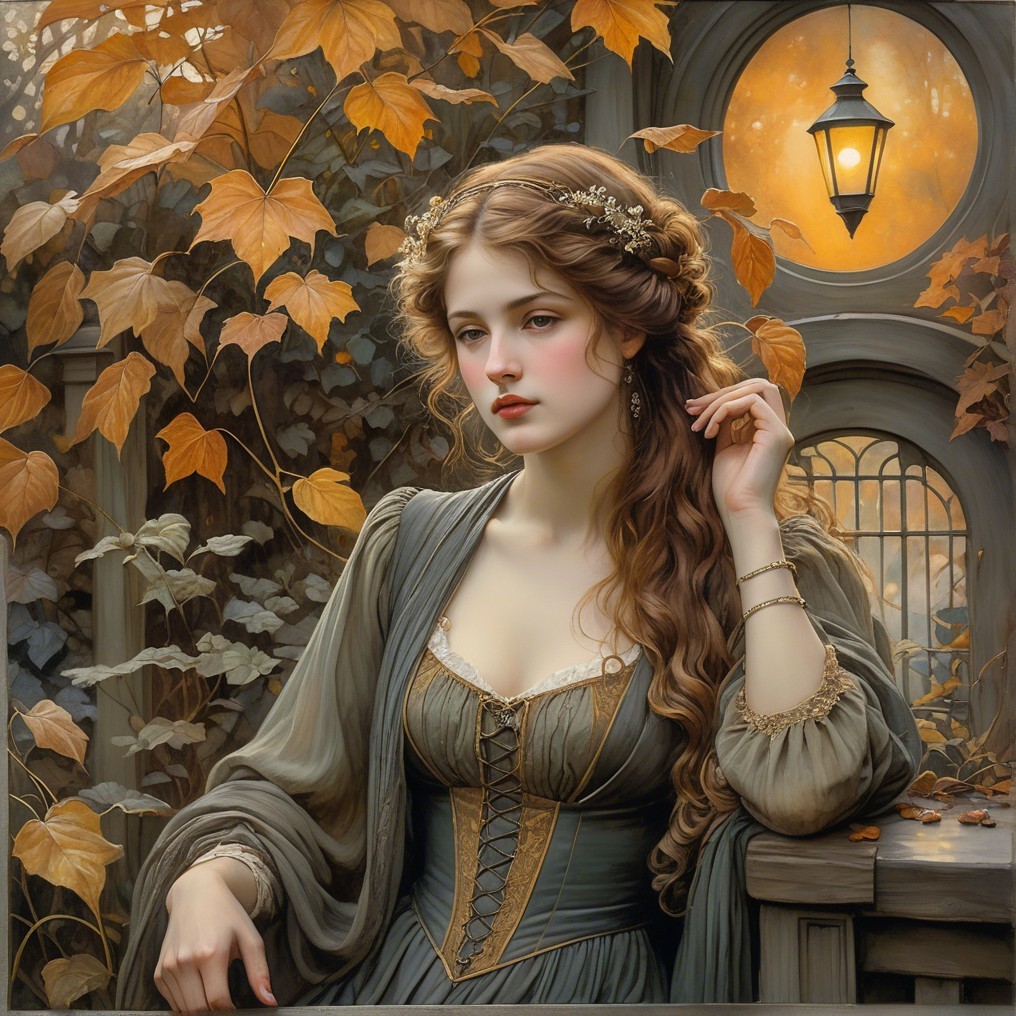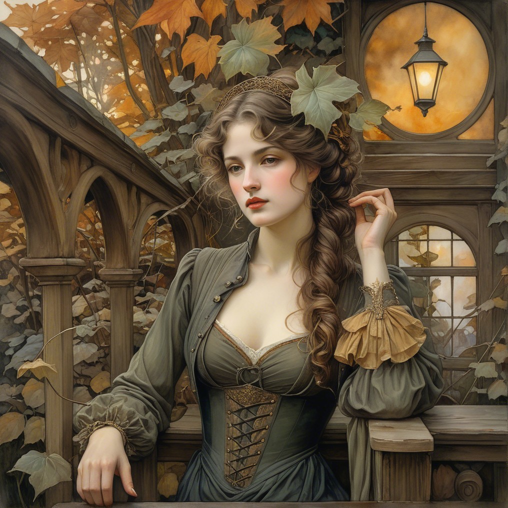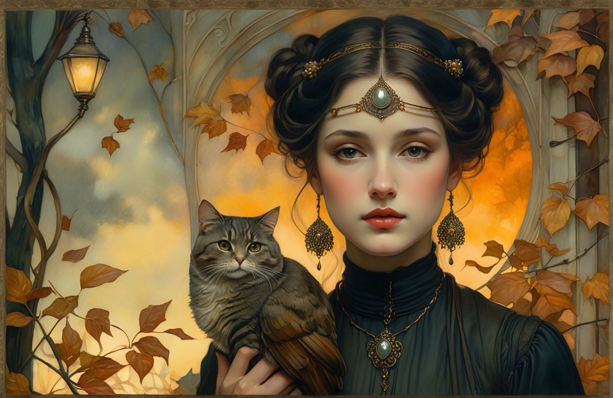 A young woman with intricate hairstyles gazes thoughtfully, accompanied by a tabby cat. The backdrop features autumn leaves and a soft, warm sky, evoking a serene, enchanting atmosphere.