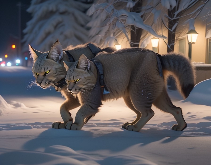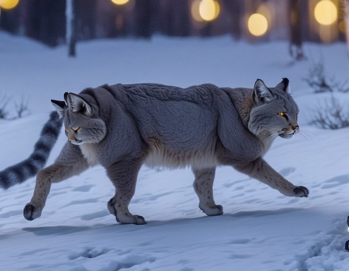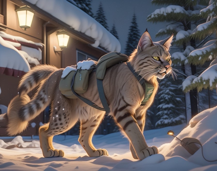 A stylized digital illustration of a bobcat walking through a snowy night landscape, with warm streetlights in the background.