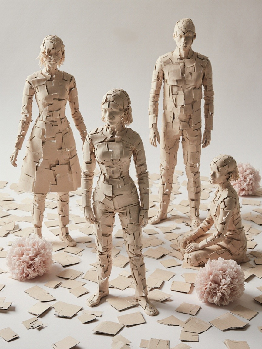 Five abstract, mannequin-like figures made of brown paper wear stylish outfits. They stand and kneel on a light floor, surrounded by large pink flowers, creating a unique visual contrast.