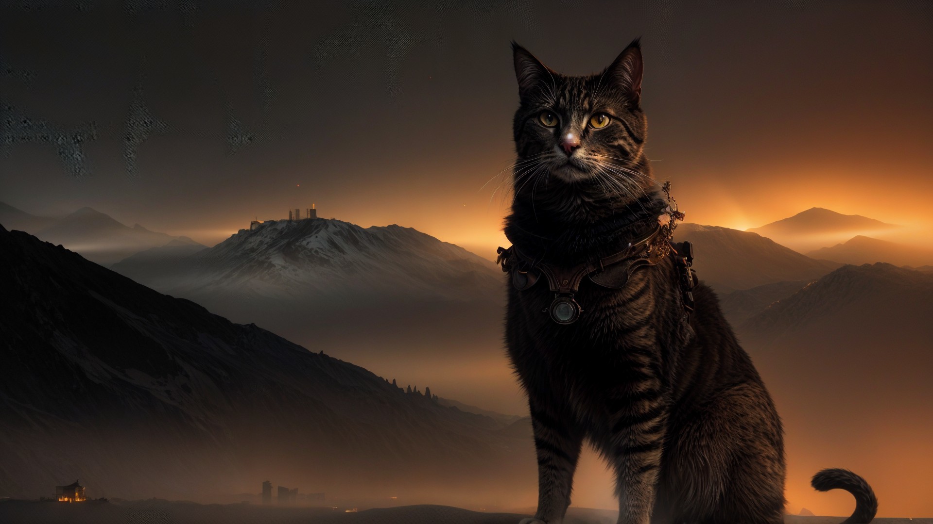 Prompt: "151515: ethereal wallpaper of brave cat shrouded in eerie ambiance,shot from above,against foggy backdrop,dark golden and light orange hues,vintage flair,surrealistic vibe,evoking sci-fi film,exuding mystery;high-res,cinematic lighting,intricate details,photorealistic quality,Nikon Z9,85mm F1.2 lens,8k resolution"