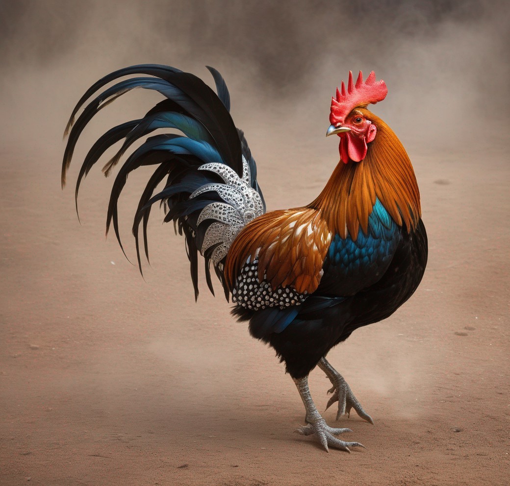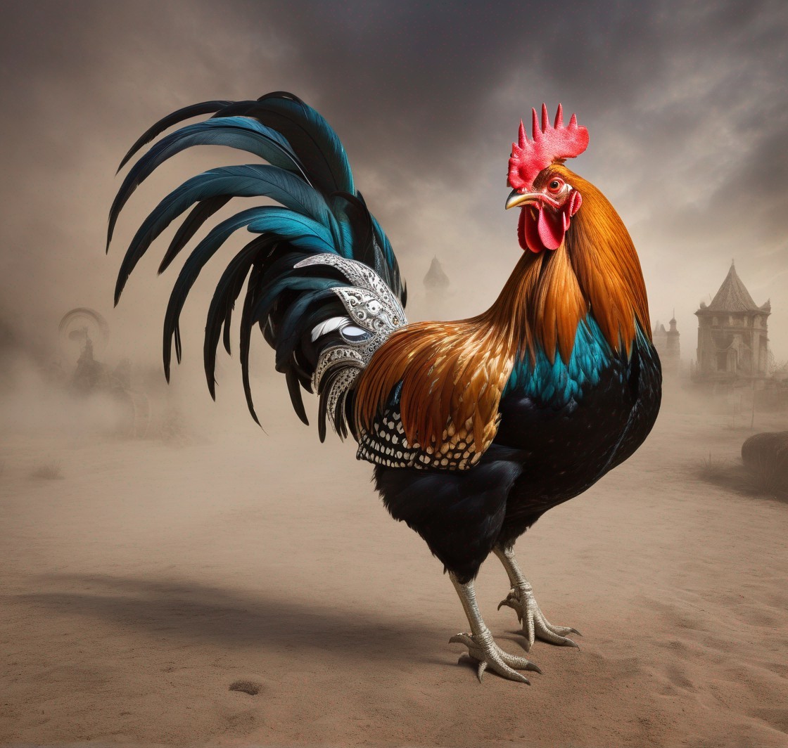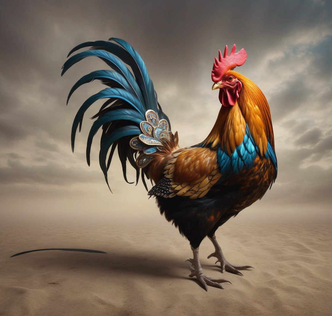 Prompt: The Apostrophe Catastrophe, surrealism, magic realism, fantasy, whimsical, weird, chaotic, very detailed, rooster dressed in extravagant royal outfit costume