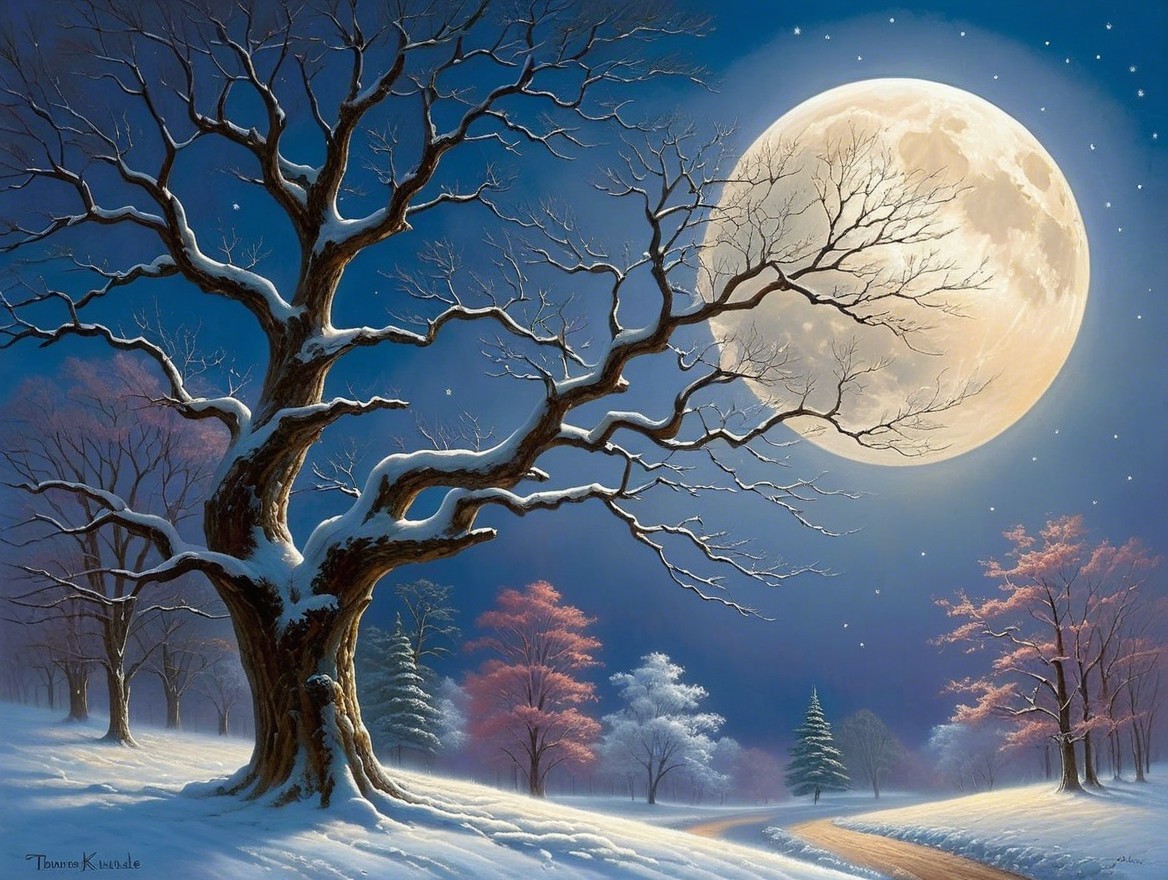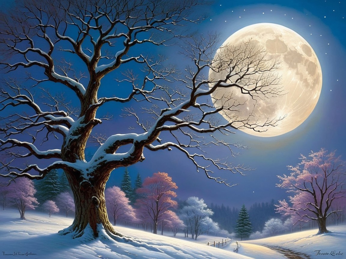 A winter landscape features a bare tree adorned with snow under a luminous full moon. Soft pastel hues of distant trees contrast against the night sky, highlighting the beauty of the snow-covered tree in the foreground.