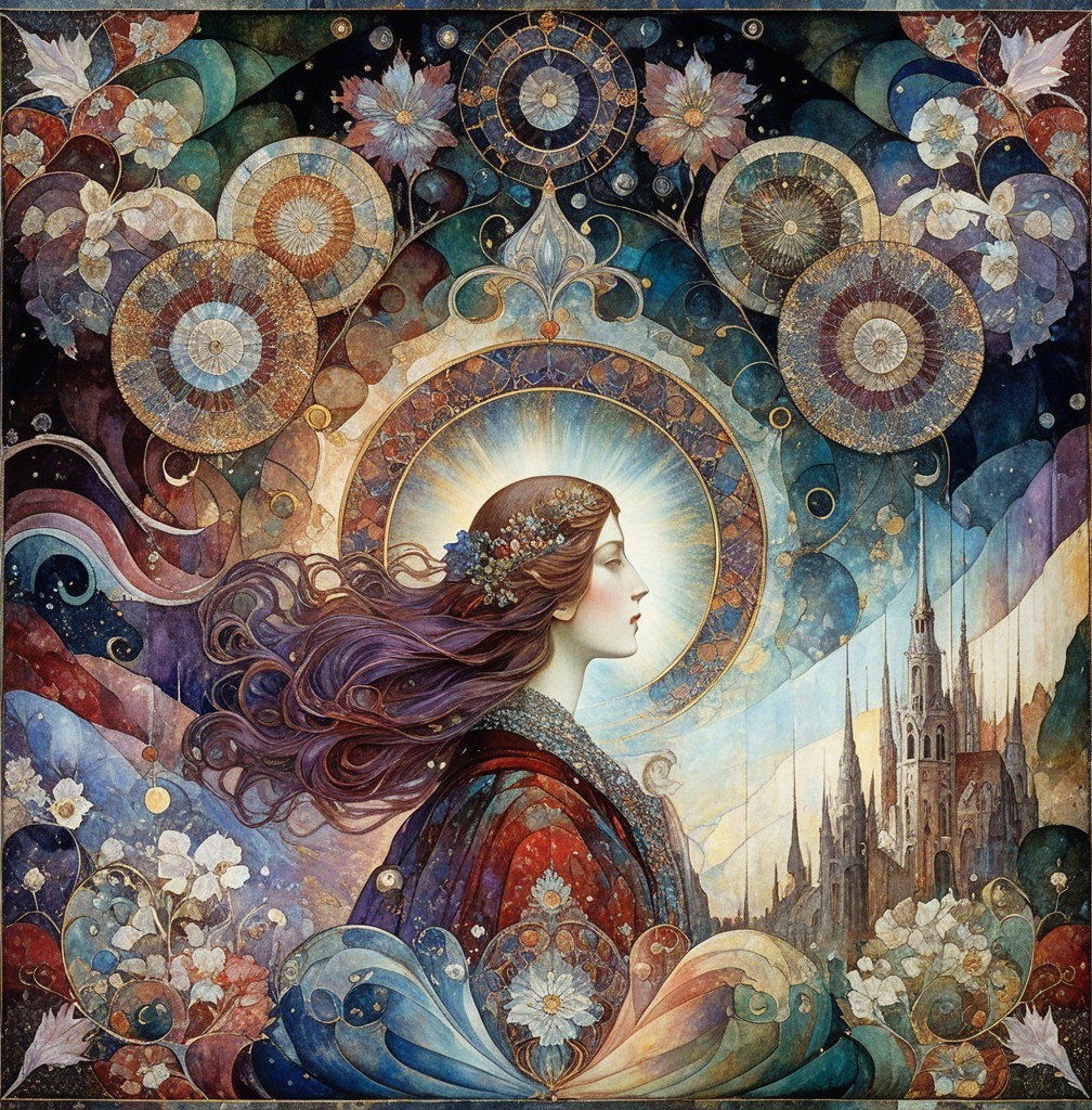 A mesmerizing portrait of a woman with flowing hair, adorned in colorful, swirling patterns. Ethereal elements like circles and flowers create a dreamlike, serene atmosphere.