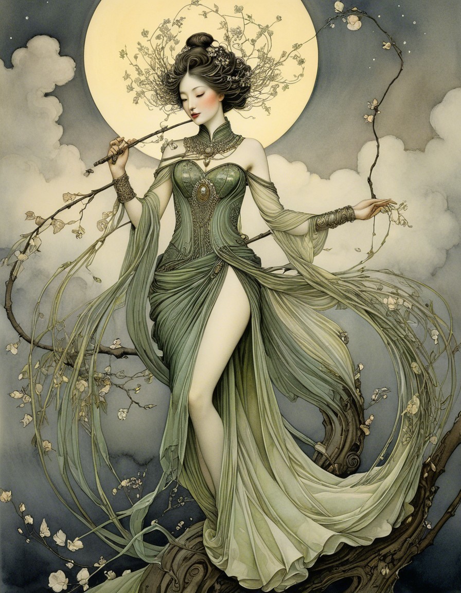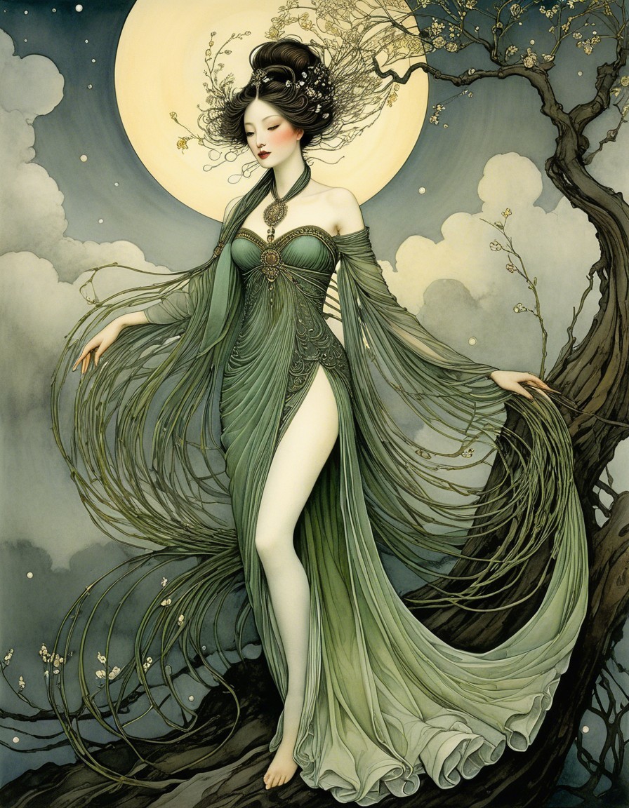 A serene figure in flowing green attire stands gracefully beside a twisted tree, illuminated by a full moon. Delicate details and a mystical atmosphere create a dreamlike scene.