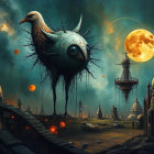 A surreal landscape blends fantasy and science fiction, featuring a giant bird-like figure atop a sphere, with a moon and stars overhead. Twisted architecture and fiery orbs create a mysterious ambiance.