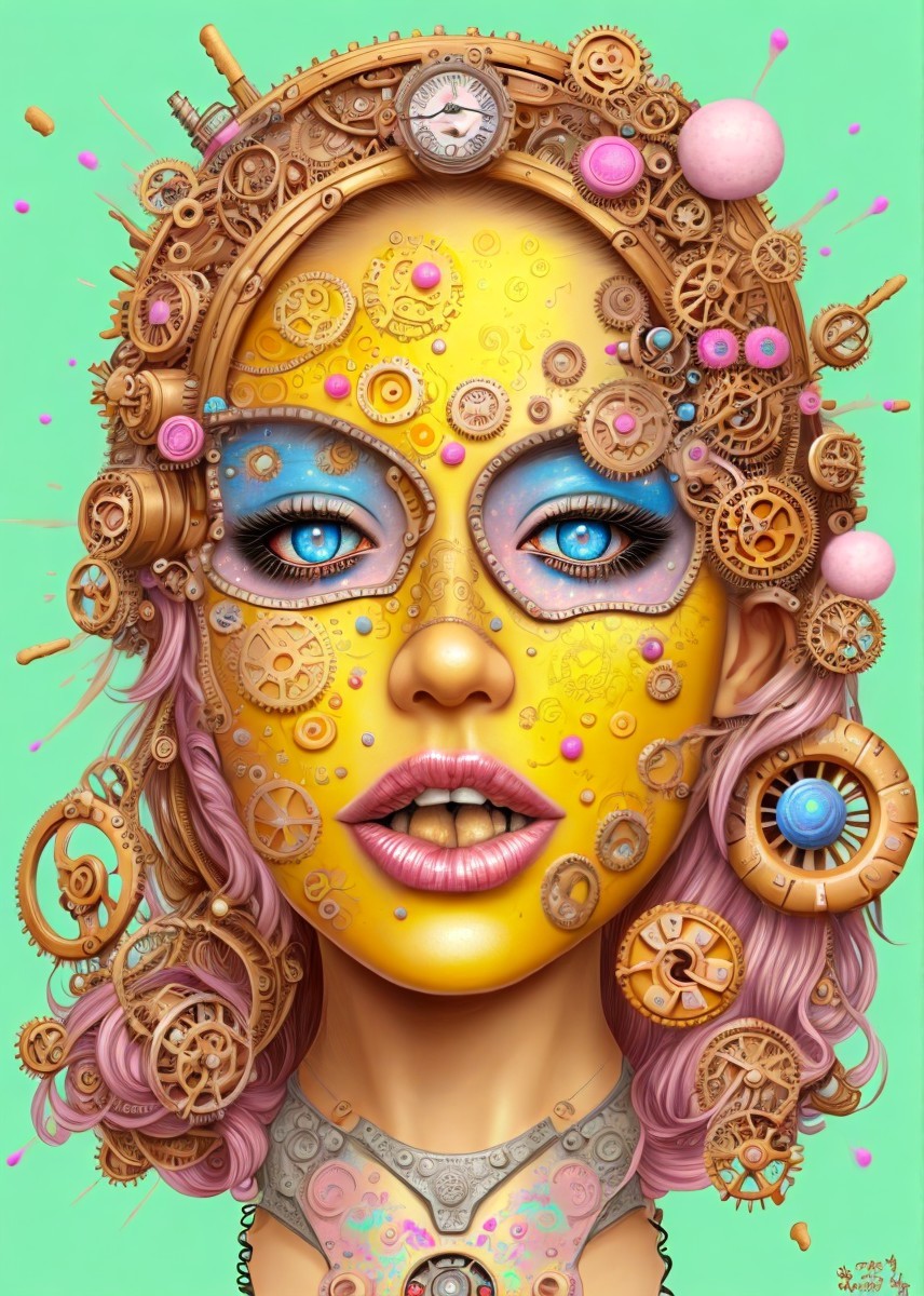 Prompt: Pop Surrealism, steampunk, beautiful female face with hair made of cotton candy, big lips of candyfloss, magic icing sugar, decorated with candy, marshmallows, biscuits, tints of pointillism, embossed strokes, steampunk background with embossed flares, illustrative style, mechanical fittings, maximalism, hearty essence,