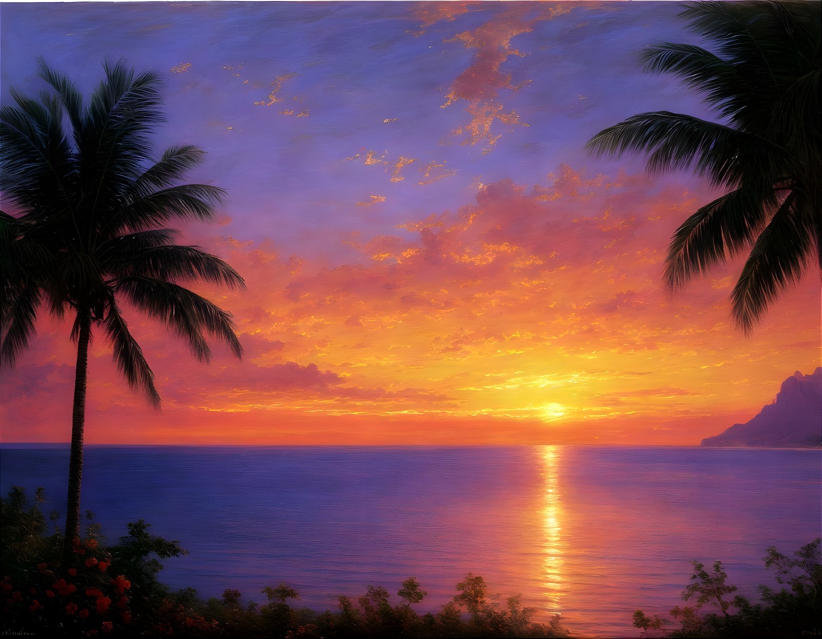 Oil on canvas, wide angle landscape view, a magnificent sunset at Tahiti. Glowing with vibrant hues, glowing with vibrant hues, sky transitioning from warm orange to deep purple. Perfect composition. By Peter Paul Rubens. William Turner. By Pierre-Auguste Cot.