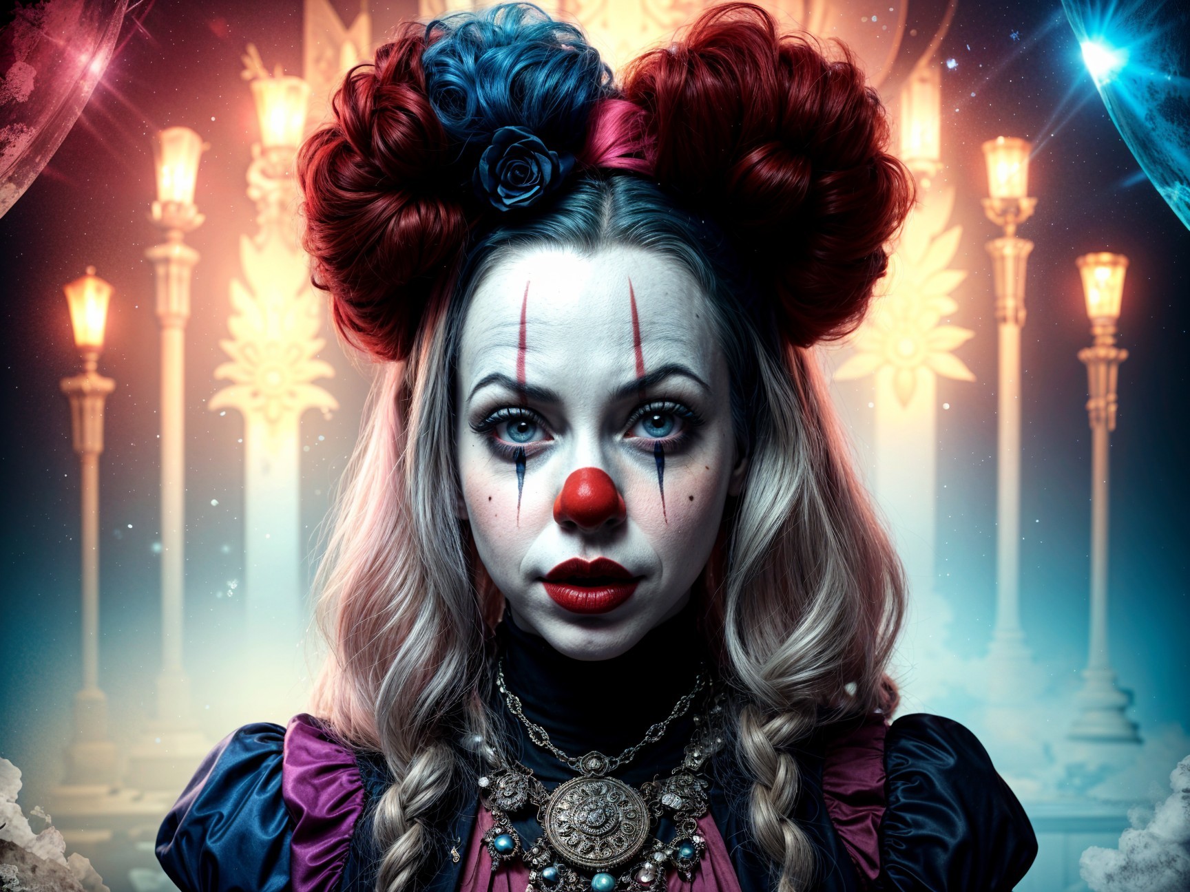 A hauntingly beautiful clown with a vibrant bow, striking red lips, and dramatic makeup. Surrounded by ethereal flames and ghostly figures, she exudes a captivating, mysterious aura.