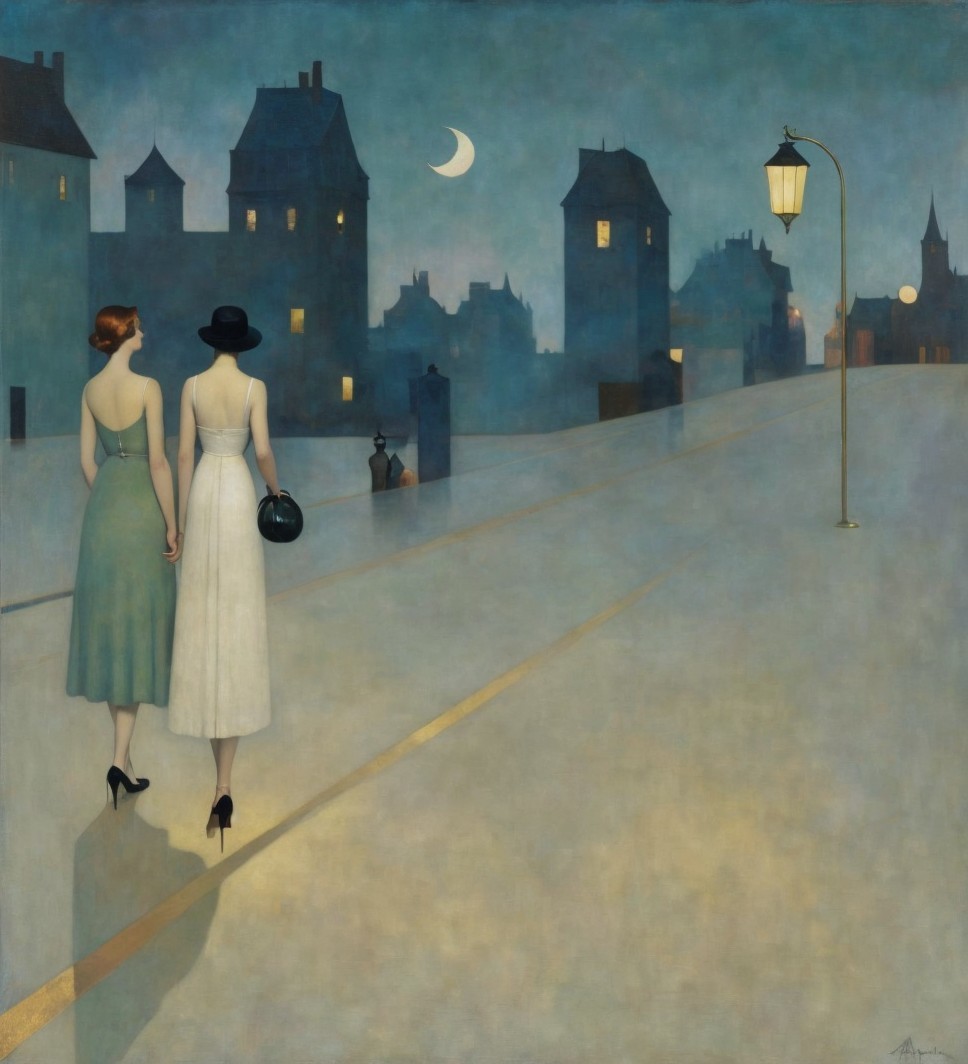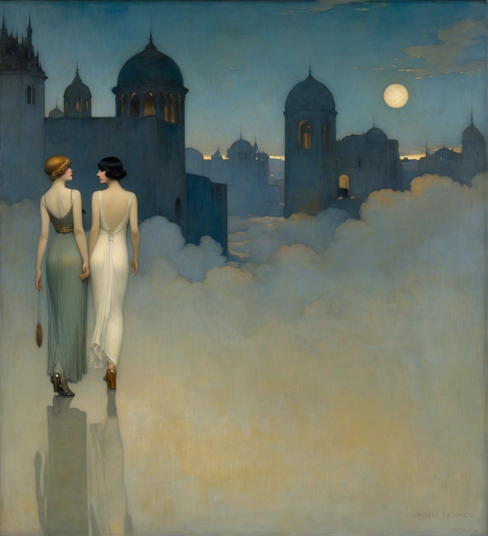 A graceful figure holds a crystalline orb under a twilight sky, surrounded by silhouettes of domed buildings. Ethereal moons hover above, creating a dreamlike atmosphere.