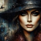 Portrait of a woman with captivating eyes wearing a wide-brimmed hat. The background depicts abstract, colorful textures enhanced by silhouettes of birds.