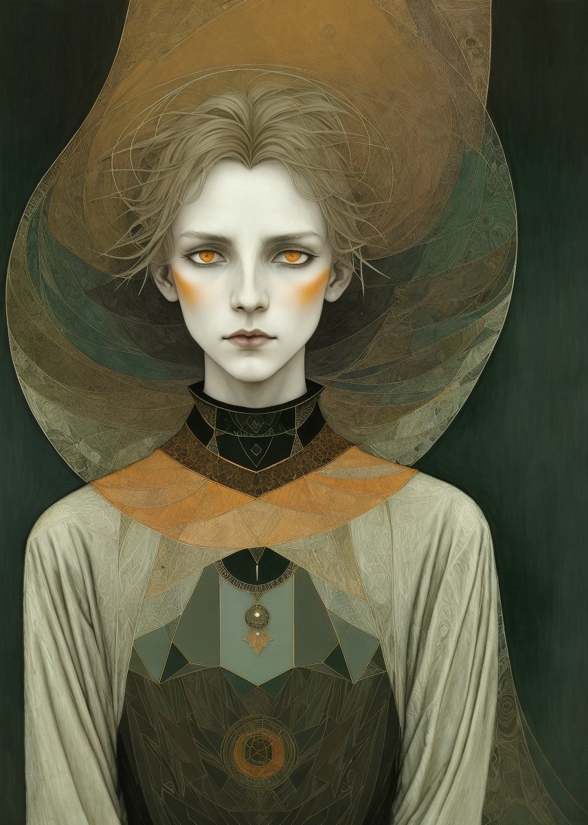 A woman with fiery red hair and a dark ruffled collar gazes intently, her hair windswept, against a muted background.