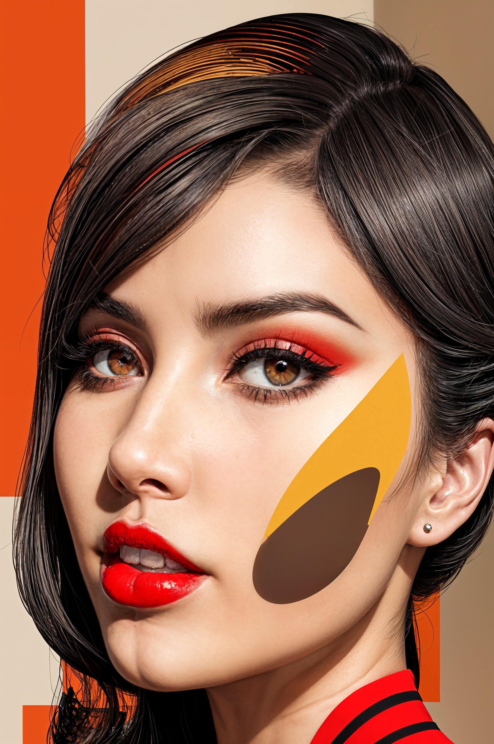 Stylized woodblock print, stylized line-art, Handsome actress with detailed red lips, she is aware of the dark realm of her career, stylized cubistic details, thick bold lineage, very hard brush stroke, paint drifts, headshot, triadic color scheme beige ochre amber, stacked-up perspective, colored ink textures, custom_loss: black, calming Lovecraftian confinement, deep and rich color palette, golden foil reflections, textured impasto oil rain effect, op art-stuckism fusion, speed painting, dynamic paint drips, thick and bold brush strokes, abstract, grunge, fashion photography, acid spill, streamline_moderne, background consists of cubistic patterns with hues of warm oranges and cool greys with silhouettes of fractal patterns, platinum foil accents. Influenced by the styles of Margaret Keane, Ernst Haeckel, Overton Loyd and Hsiao Ron Cheng. Intricate rim lighting, dynamic lighting effects.symmetric, brightness 1.3, acrylic art, focused, ,stunning color depth, delicate coloring 1.9, luminosity 1.3, beautiful composition 1.9, coffinwood 1.7, anisotropic filtering 1.7, ambient occlusion 1.5, raytraced shadows 1.8, sublime, subtle, spiritual, golden ratio, joyful beautiful composition 1.9, coffinwood 1.7,