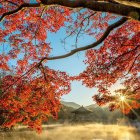 A serene landscape at sunset, featuring vibrant autumn trees with red and orange leaves. A calm lake reflects the scenery, while distant mountains add depth to the tranquil atmosphere.