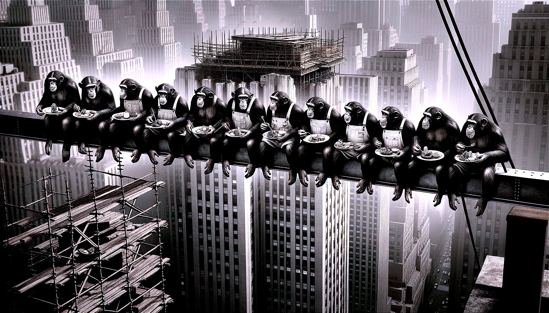 A stunning recreation of the iconic "Lunch atop a Skyscraper" photo, featuring eleven chimpanzees in the same poses and attire as the original ironworkers. The artwork is highly detailed, realistic, and beautifully executed, The digital painting captures intricate details in a surreal and fantasy setting, creating an award